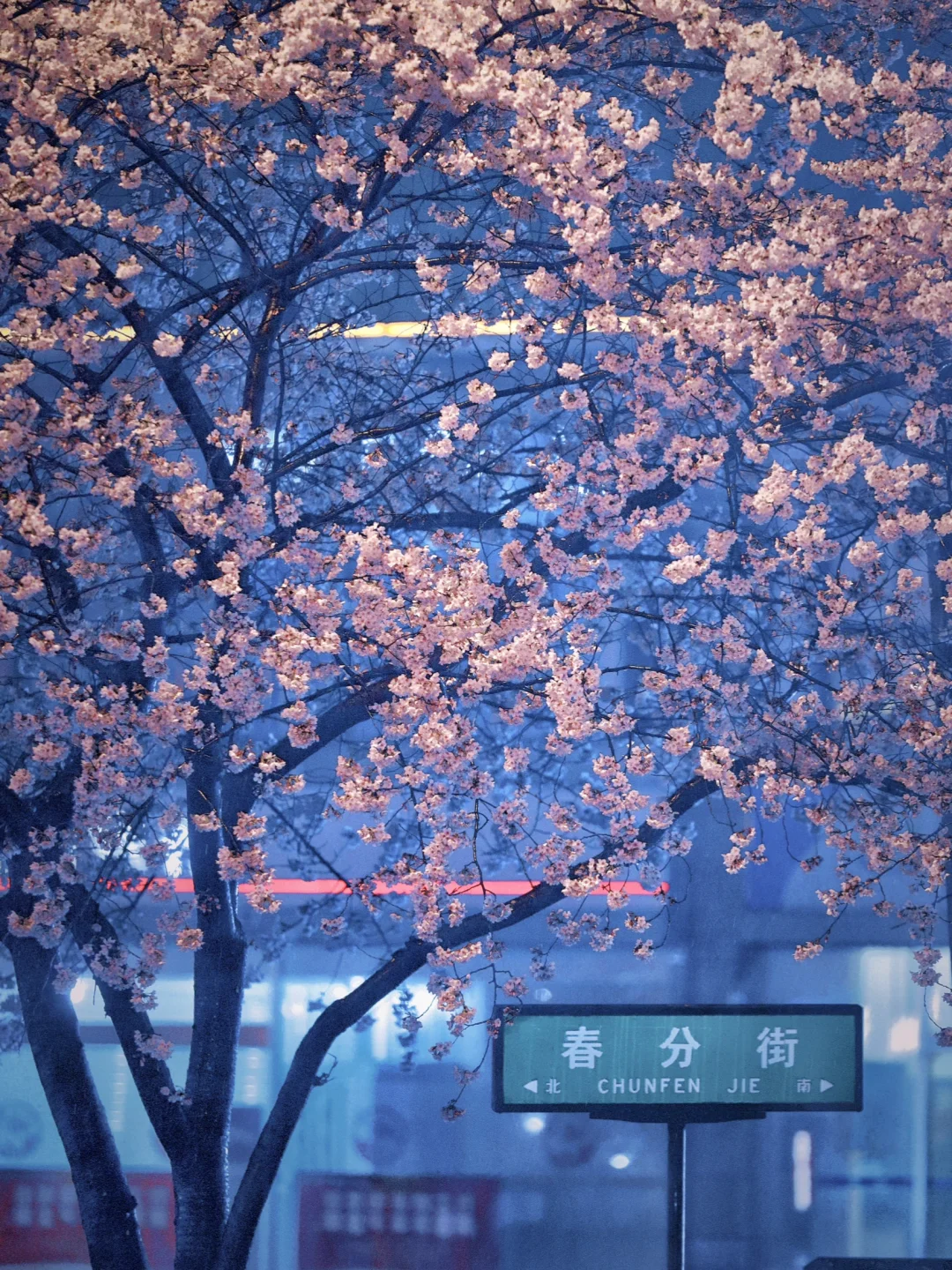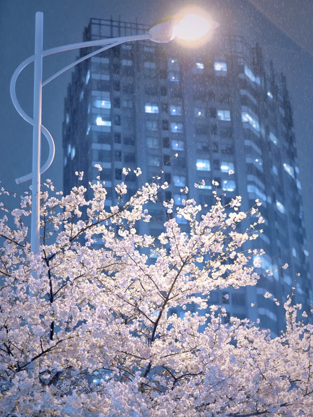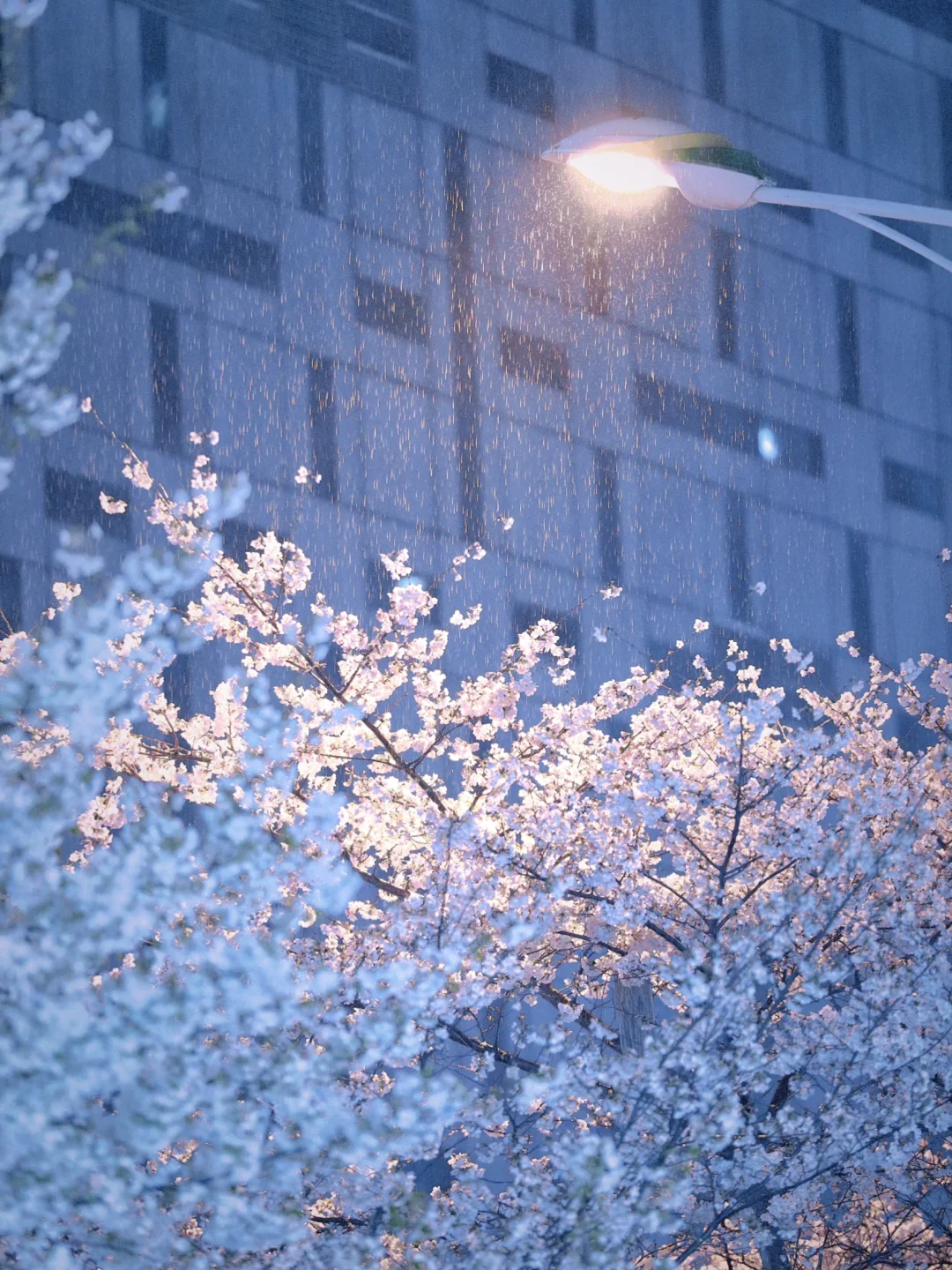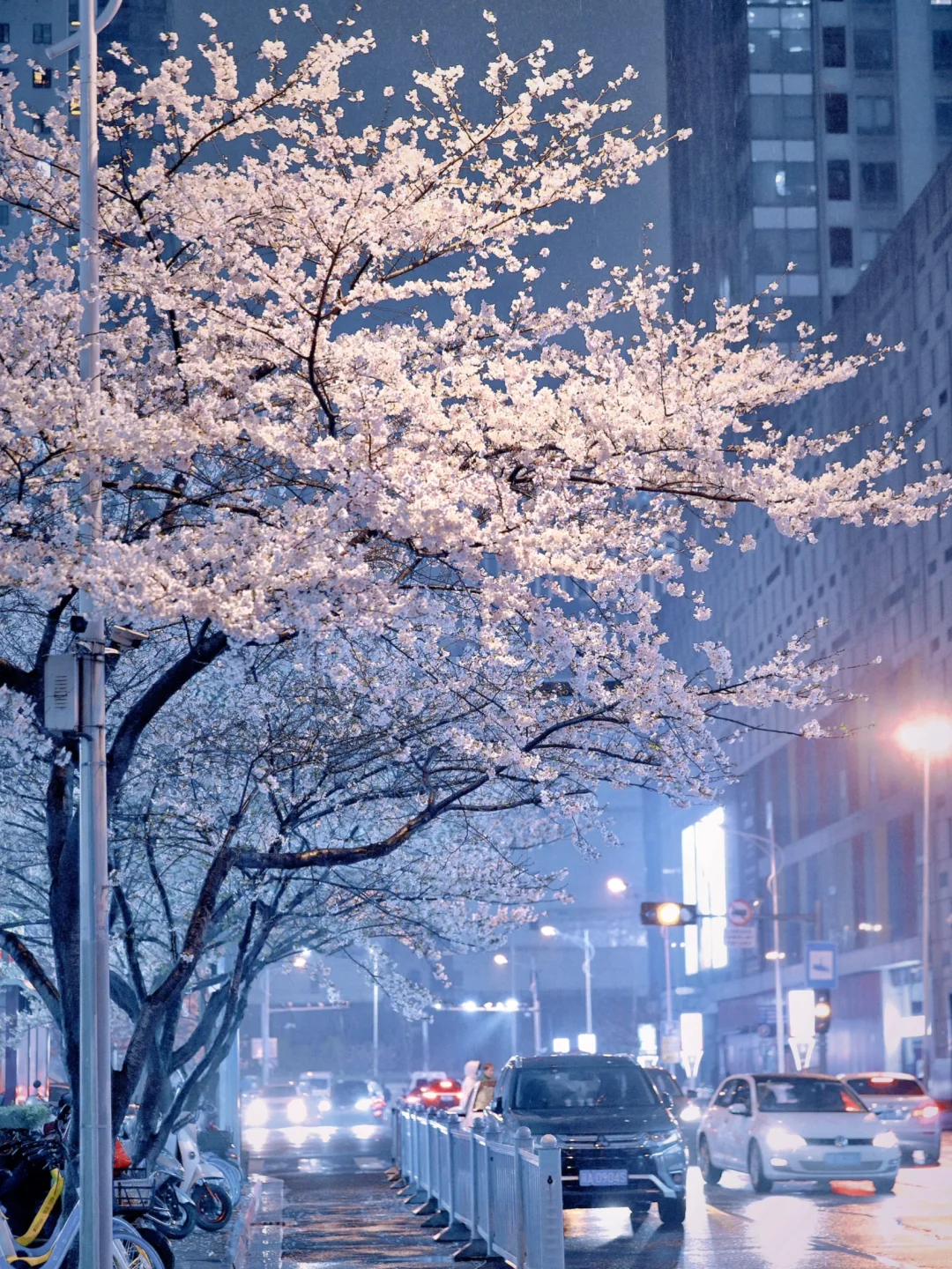 苏州春分街的夜樱🌸在雨中盛开🌧️ 雨滴落下🌧️ 在路灯的照射下✨ 好似天上坠落的无数繁星🌌 温馨而又浪漫💙 . 📍苏州春分街 .