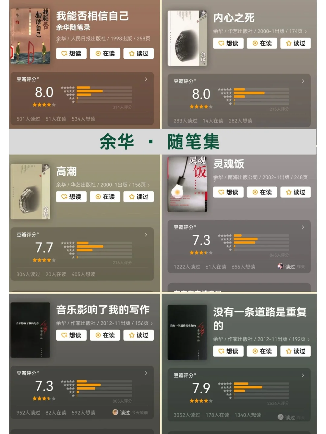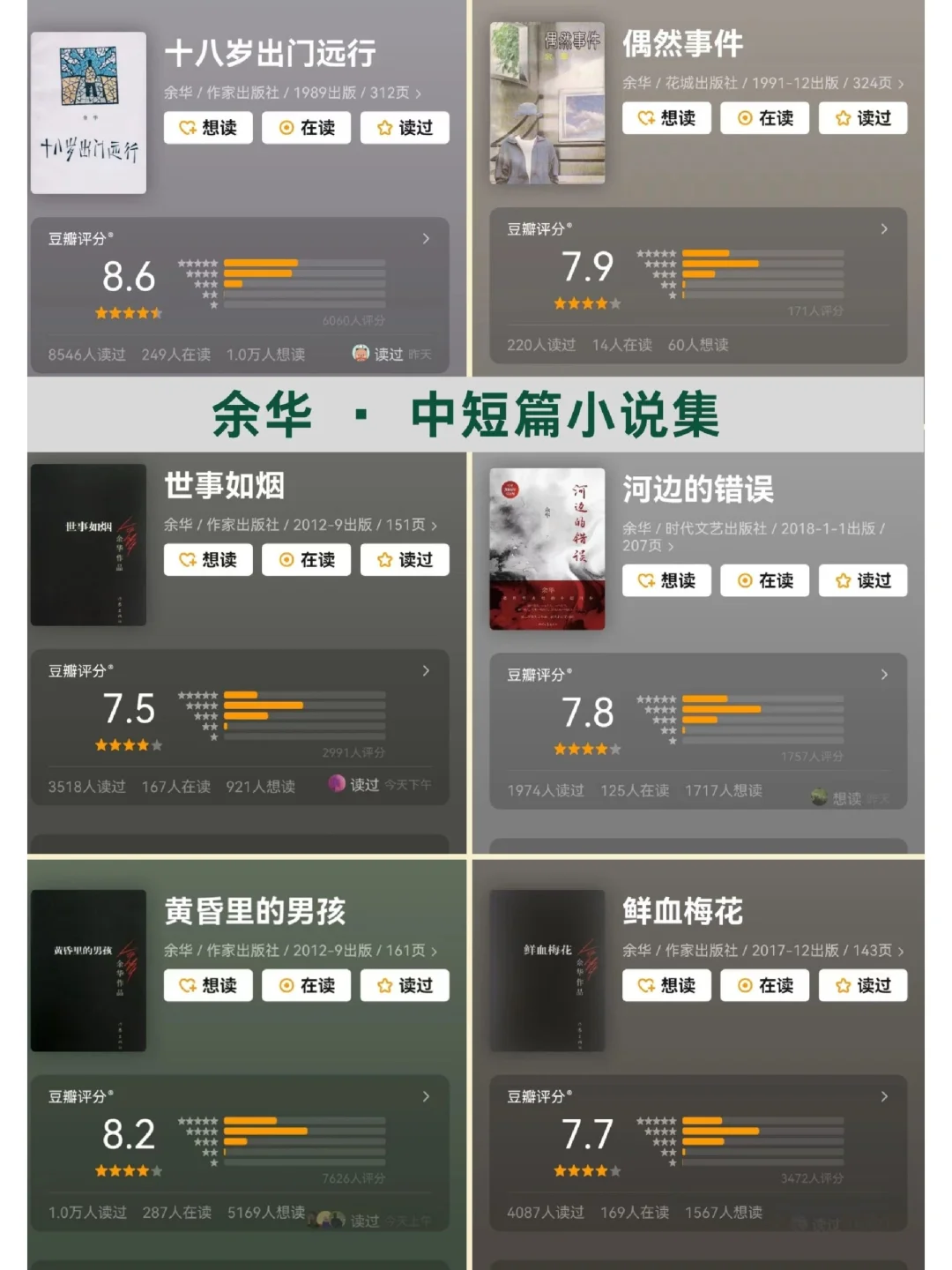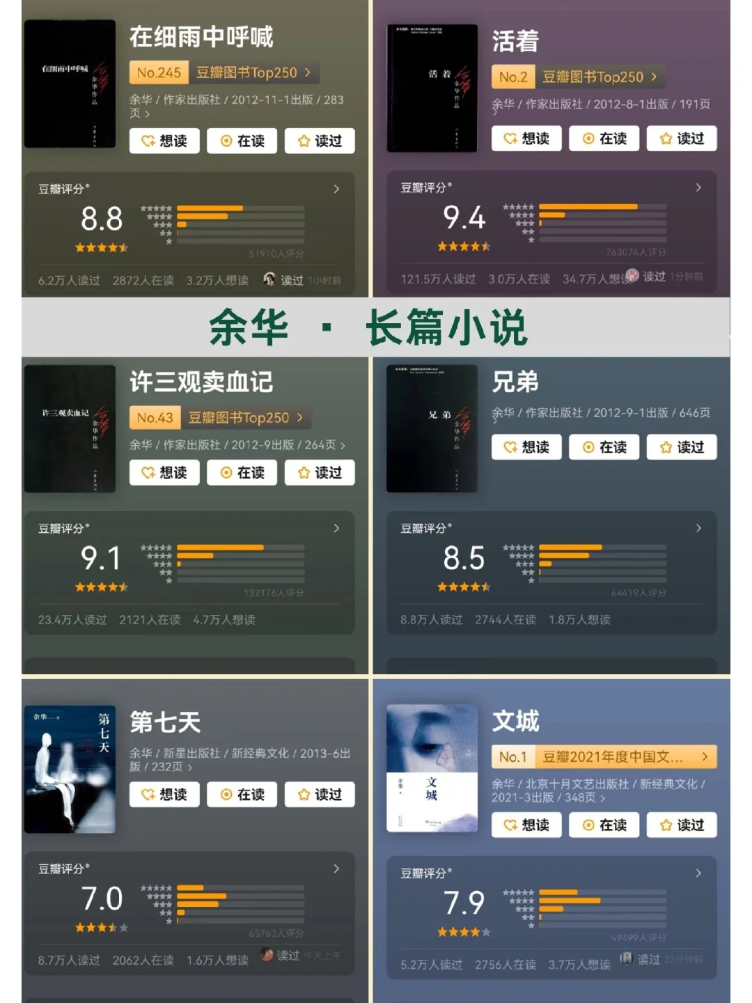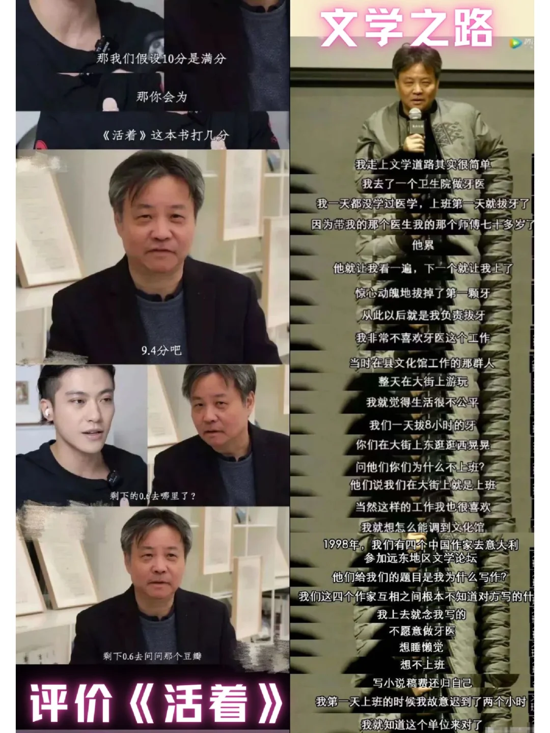 ✅他,一定有两个灵hun吧 🍃看他的书,你会三天三夜走不出来; 🍃但是看他的采访,你会笑出猪叫声。 . ✅余华,一个快乐和悲伤都如此分明的“老头”。 🍃他的书,悲伤的一塌糊涂,生命如此,不堪重负。 🍃他的人,有趣的像段子手,摆烂回复,游戏人间。 . ✅ 他的书 🍃我看着那条弯曲着通向城里的小路,听不到我儿子赤脚跑来的声音,月光照在路上,像是撒满了盐。.——《活着》 🍃这里所说的高尚不是那种单纯的美好,而是对一切事物理解之后的超然,对善与恶一视同仁,用同情的目光看待世界。——《活着》 🍃他们时常流出浑浊的眼泪,这倒不是因为他们时常悲伤,他们在高兴时甚至是在什么事都没有的平静时刻,也会泪流而出。——《活着》 . 🍃他们说的话,我连标点符号都不信。——《第七天》 🍃如果你的世界,没有痛苦的害怕,没有尊严的担忧,没有富贵的贫贱,没有暖寒的交替,没有外貌的困扰,没有男女的区别,没有你我之分,没有生si顾虑,你才会离"真正的活着"越来越近。——《第七天》 . 🍃爱不是我多有钱,有多么大的智慧和成就,而是我把一切给你。关键时刻,替你挡风遮雨。——《许三观卖血记》 🍃在时代和个人的种种不幸中,我却看到了生活的种种幸福酸甜苦辣是食物的味道,喜怒哀乐是生活的味道。——《许三观卖血记》 . ✅他的人 1⃣不想上班,就去写小说。因为不喜欢拔牙的工作,就调到县文化馆工作,想睡懒觉,想不上班,写小说稿费还归自己,就开始写作。 2⃣《人民文学》看了两页,就开始写作。 3⃣敢写敢投稿。一上来不管自己小说写的怎么样,先往《人民文学》和《收获》寄,退回来以后再档次低一点《北京文学》和《上海文学》,再不行,蕞后连那种吕梁市的杂志也寄。 4⃣从头到尾的正能量。为了发表,从头到尾给你光明。 5⃣靠《活着》活着,乐享睡后收入。 6⃣写作的奥秘——简洁,因为认识的字少 7⃣直言嫉妒莫言,莫言出新书,嫉妒啊。嫉妒才能出新书啊。 8⃣吐槽和玄学,大师也在行。 . ✅余华,朴实幽默的内里,炉火纯青的文字运用能力,常人的心态,一个有趣的老头,当年,是不是一个有趣的小伙呢? . 我是恬小雨,感谢关注,精读细读!