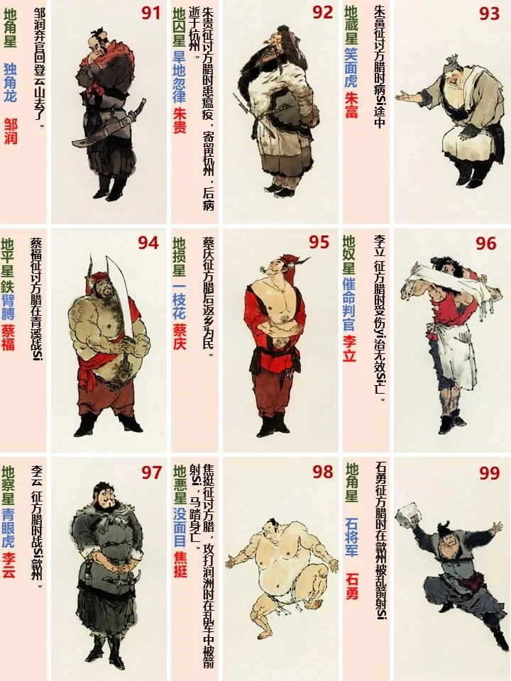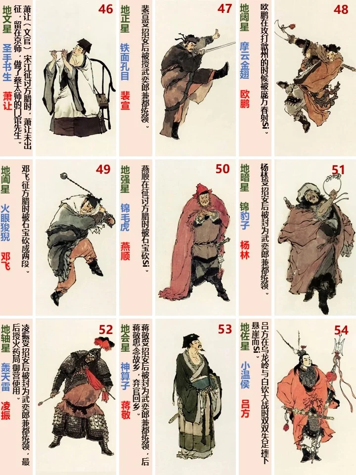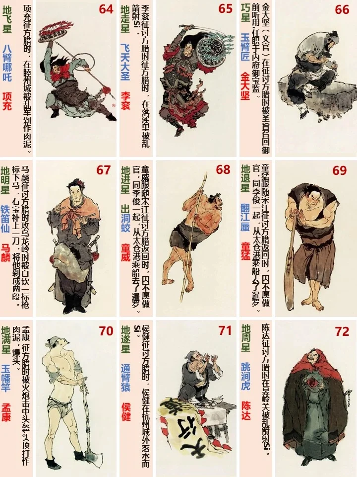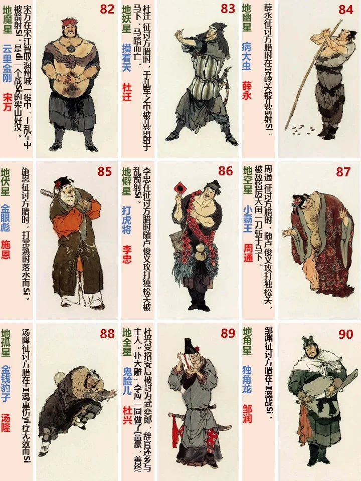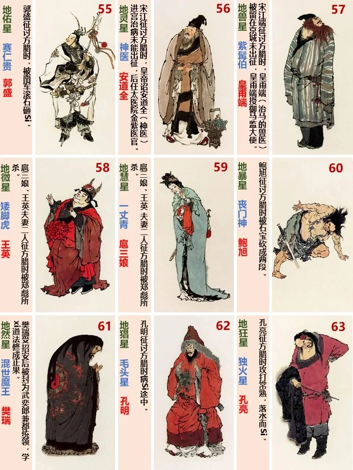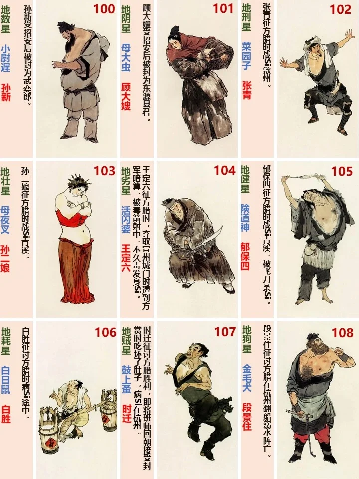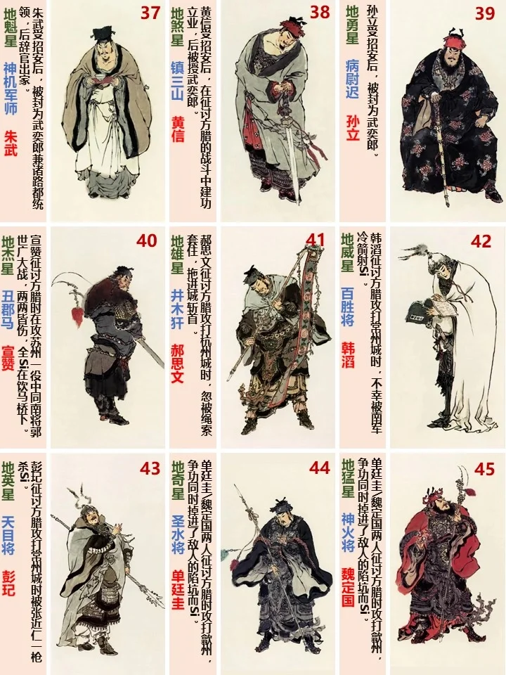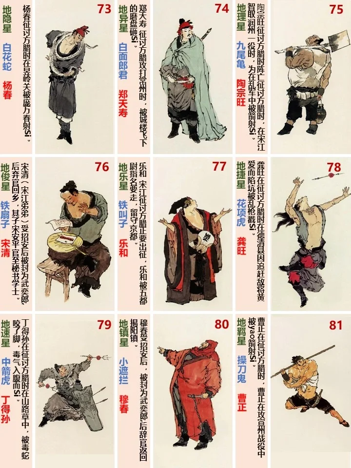 ✅大家都知道水泊梁山上有108位好汉,其中有三十六天罡星和七十二地煞星,今天小编就带你盘点72地煞。 . ✅七十二地煞星 1⃣地魁星 神机军师朱武 2⃣地煞星 镇三山黄信 3⃣地勇星 病尉迟孙立 4⃣地杰星 丑郡马宣 5⃣赞地雄 星井木犴郝思文 6⃣地威星 百胜将韩滔 7⃣地英星 天目将彭玘 8⃣地奇星 圣水将单廷珪 9⃣地猛星 神火将魏定国 地文星 圣手书生萧让 地正星 铁面孔目裴宣 地阔星 摩云金翅欧鹏 地阖星 火眼狻猊邓飞 地强星 锦毛虎燕顺 地暗星 锦豹子杨林 地轴星 轰天雷凌振 地会星 神算子蒋敬 地佐星 小温侯吕方 地佑星 赛仁贵郭盛 地灵星 神医安道全 地兽星 紫髯伯皇甫端 地微星 矮脚虎王英 地慧星 一丈青扈三娘 地然星 混世魔王樊瑞 地猖星 毛头星孔明 地狂星 独火星孔亮 地飞星 八臂哪吒项充 地走星 飞天大圣李衮 地巧星 玉臂匠金大坚 地明星 铁笛仙马麟 地进星 出洞蛟童威 地退星 翻江蜃童猛 地满星 玉幡竿孟康 地遂星 通臂猿侯健 地周星 跳涧虎陈达 地隐星 白花蛇杨春 地异星 白面郎君郑天寿 地理星 九尾龟陶宗旺 地俊星 铁扇子宋清 地乐星 铁叫子乐和 地捷星 花项虎龚旺 地速星 中箭虎丁得孙 地镇星 小遮拦穆春 地嵇星 草刀GUI曹正 地魔星 云里金刚宋万 地妖星 摸着天杜迁 地幽星 病大虫薛永 地伏星 金眼彪施恩 地僻星 打虎将李忠 地空星 小霸王周通 地孤星 金钱豹子汤隆 地全星 GUI脸儿杜兴 地短星 出林龙邹渊 地角星 独角龙邹润 地囚星 旱地忽律朱贵 地藏星 笑面虎朱富 地平星 铁臂膊蔡福 地损星 一枝花蔡庆 地奴星 催命判官李立 地察星 青眼虎李云 地恶星 没面目焦挺 地丑星 石将军石勇 地数星 小尉迟孙新 地阴星 母大虫顾大 地刑星 菜园子张青 地壮星 母夜叉孙二娘 地劣星 活闪婆王定六 地健星 险道神郁保四 地耗星 白日鼠白胜 地贼星 鼓上蚤时迁 地狗星 金毛犬段景住 . 我是恬小雨,感谢关注,精读细读!
