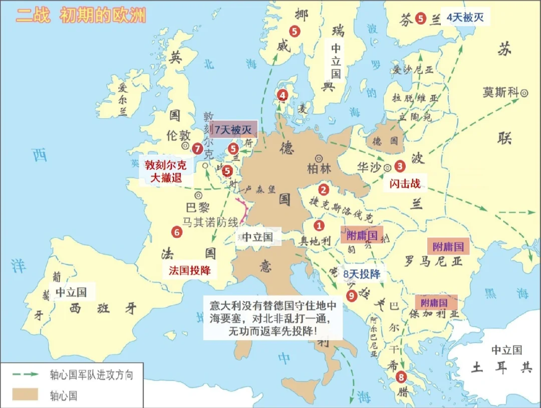 敦刻尔克大撤退使德国野心膨胀,东线入侵苏联,盟军在诺曼底成功登陆。由于低估了苏联红军的抵抗能力,以及东西两线作战,德国注定走向失败,就剩日本。