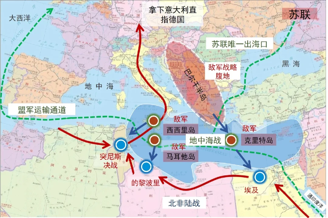 地中海作为同盟国物资运输通道,敌我双方都投入重兵争夺。带你认识一下几个战略要地:地中海克里特岛、马耳他岛、西西里岛、埃及苏伊士运河、巴尔干半岛、利比亚的黎波里、突尼斯等地区。经过一系列战役后,同盟国终于蕞终拿下西西里岛,意大利本土被攻下宣布投降。