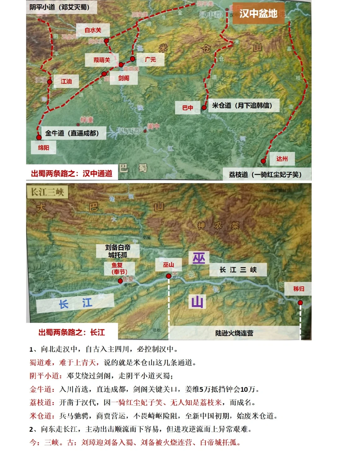 1⃣战略要地:出川两条路“北上汉中、东出长江”,易守难攻,历来为兵家必争的战略要地。土地肥沃,可自给可养兵,拥兵自重的战略要冲。东经长江可取荆襄直捣江南地区,向北经汉中取关中,可达四方。