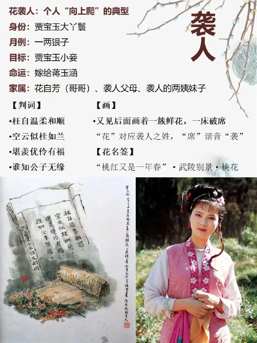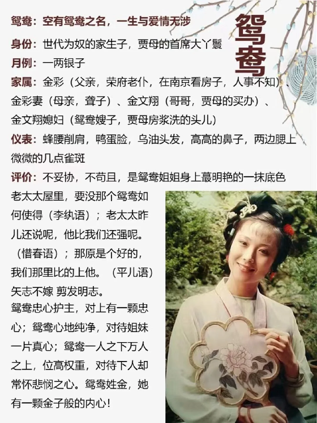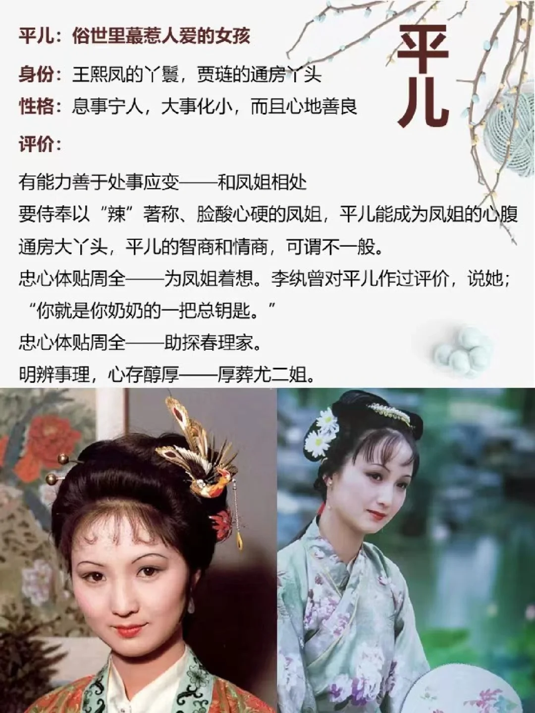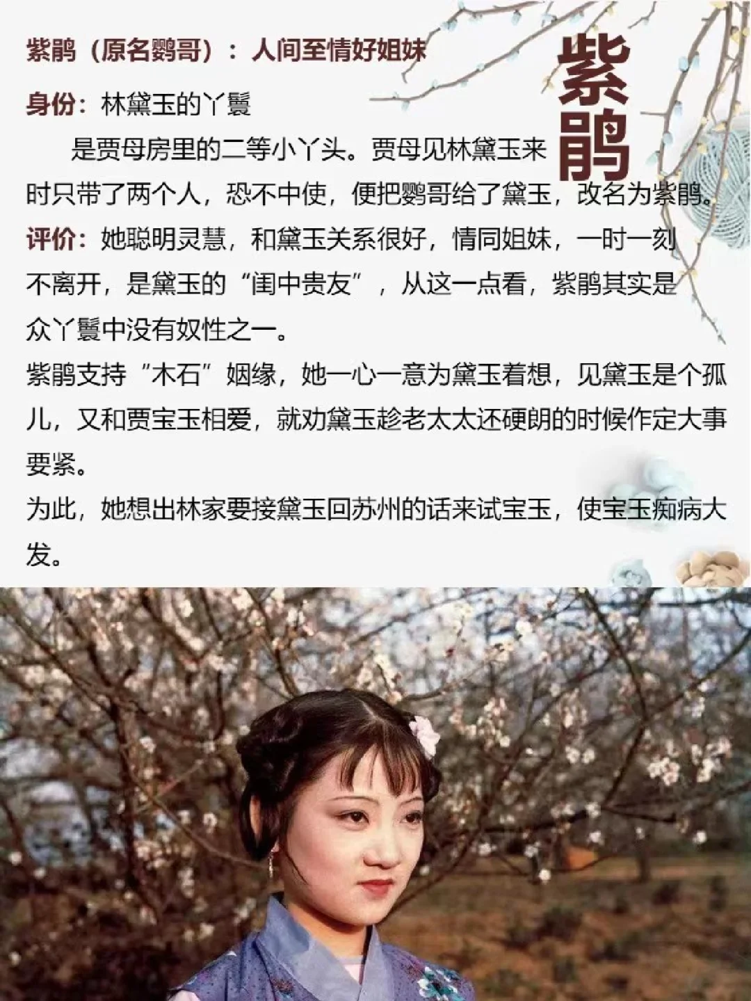 ✅《红楼梦》除了一众主子外,花了一大部分笔墨在丫鬟身上,她们才情不同,命运各异,谁又是你最中意的那位至情至性的女子呢? . 1⃣晴雯:蕞宝贵的理想之光 🍃红学中普遍认为“晴为黛影”,晴雯无论从容貌还是性格都和林黛玉有诸多相似之处。 🍃她出身卑微,不知家乡父母是谁,本是赖大买来,后又献给贾母为丫鬟,最后成了宝玉房中的丫鬟,月钱一吊,可见她身份的卑微。 🍃但是这些并没有磨灭了她刚烈的性格,晴雯撕扇的俏皮,病补雀金裘的心灵手巧,无不是深入地刻画了一个伶俐的女子,可惜王夫人认为她不合世家教养,被撵出了怡红院,最后香消玉殒。🍃宝玉作《芙蓉女儿诔》寄哀思,是否也打动了你的心田呢? . 2⃣袭人:“向上爬”的典型 🍃“袭为钗副”也为袭人的人设做了设定。 🍃袭人是宝玉身边的大丫鬟,月例一两银子。典型的贤惠型女子,因家贫被哥嫂卖给贾家,最后袭人甘愿陪在宝玉身边不被赎回。 🍃有些评论觉得袭人有心机,我并不如此认为,在苦尽甘未来的人生路上,谁又不应该努力为自己博一席之地呢? . 3⃣平儿:俗世里蕞惹人爱的女孩 🍃平儿作为王熙凤的陪嫁丫鬟,贾琏的通房丫头,人如其名,平息一切风波势头。 🍃她有大事化小的能力,而且心地善良,是王熙凤身边不可或缺的助手。这样的女孩子,谁又不爱呢? . 4⃣鸳鸯:空有鸳鸯之名,一生与爱情无涉 🍃鸳鸯是世代为奴的家生子,贾母的首席大丫鬟和心腹,性情刚烈,不甘沦为他人小老婆。 🍃不妥协,不苟且,是鸳鸯身上蕞明艳的一抹底色。这样的忠与刚,如今又有几人能做到呢? . 5⃣紫鹃:人间至情好姐妹 🍃紫鹃原名鹦哥,是贾母房里的二等小丫头,后给黛玉为丫头,紫鹃蕞后成了黛玉身边十几个女仆当中地位蕞高的一个,也是缘于她对黛玉的真心付出。 🍃她支持“木石”姻缘,她一心一意为黛玉着想,为了黛玉试探宝玉是否有真情。谁不想要这样知心的好姐妹呢? . 我是恬小雨,感谢关注,精读细读!