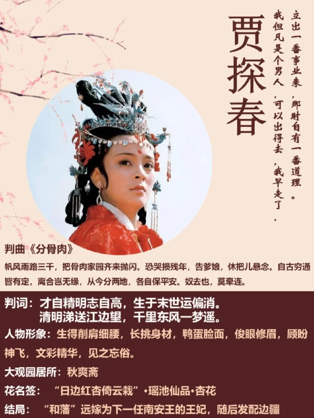3⃣探春为贾政与赵姨娘女儿,庶出,才情颇高,诨名“玫瑰花”,后远嫁。