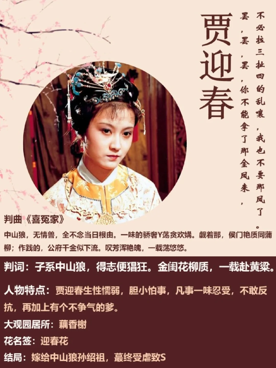 2⃣迎春为贾赦女儿,但并非为邢夫人所出,诨名“二木头”,性情温和,才智愚钝,嫁于“中山狼”孙绍祖。