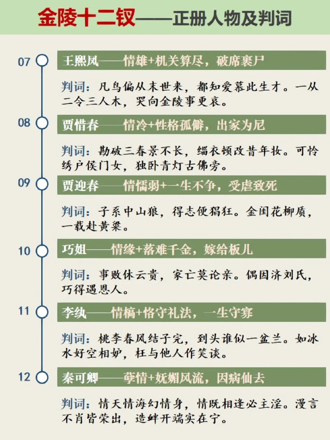林黛玉、薛宝钗、贾元春、贾探春、史湘云、妙玉、贾迎春、贾惜春、王熙凤、贾巧姐、李纨、秦可卿。