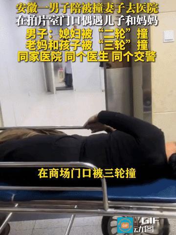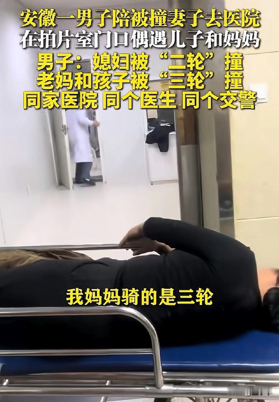 有福同享,有难同当!安徽,一男子送被撞的妻子去医院,竟然发现了母亲也被撞了,尤其还是同一家医院,同一个科室,同一个医生,就连交警也是同一个人。网友: 一定是特别的缘分,才能成为一家人。 刘女士早上去上班,刚到门口时就被一个骑车的撞了,刘女士就让老公过来和肇事者一起去医院做检查。 刘女士在拍完片子出来后,就在医院里面看到一个小孩和自己的孩子很像,就跟老公说了这个孩子很像咱们的孩子。 这时,孩子旁边一个躺着一个老人,老人抬头的瞬间被刘女士看到了,脑子瞬间炸了,这不是婆婆吗? 两人上前询问,这才得知婆婆骑着三轮车带孩子在商场门口也被人给撞了,一家人真是哭笑不得,自己骑着二轮车被二轮车撞,婆婆骑着三轮车被三轮车撞,同一个医生,还是同一个交警处理的。 刘女士觉得也太巧了,就连电视剧都无法演,随手就把这个分享到了网上,引起了热议。 有网友表示, 还好不是同一个电瓶车撞的,不然就巧到家了[泪奔] 也有网友玩笑的说道,还好不是婆媳撞一起!不然这男的都不知所措。 真正诠释了不是一家人,不进一家门。 你这一家子[赞] 不过话说回来,不管是开车开始骑车,必须要遵守交通规则,既能保证自己的安全,也不会给别人添麻烦不是吗?