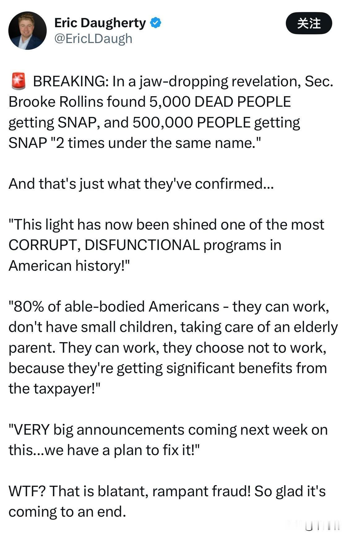 突发消息:震惊!竟有 5000名“已死亡的人”仍在领取美国食品券(SNAP),更有 50万人以同一名字重复领取两次补助! 而这还只是“已确认”的部分…… 美国农业部长布鲁克·罗林斯(Brooke Rollins)直言: “这道光照亮了美国历史上最腐败、最失能的社会救助项目之一!” 她补充说:“目前有多达80%的健全成年人——他们可以工作,没有年幼的孩子,也没有需要照顾的老人——却选择不工作,因为他们从纳税人那里拿到大量福利!” 罗林斯透露, “下周将公布重大改革措施……我们已经制定了彻底修复这一体系的计划!” 因此,必须要“小政府”。 当政府规模过大、福利体系过于庞杂、监管层级冗余导致公然欺诈滥用!