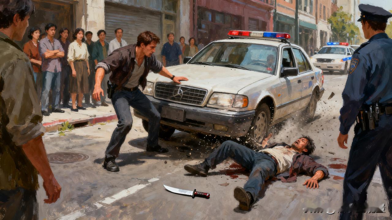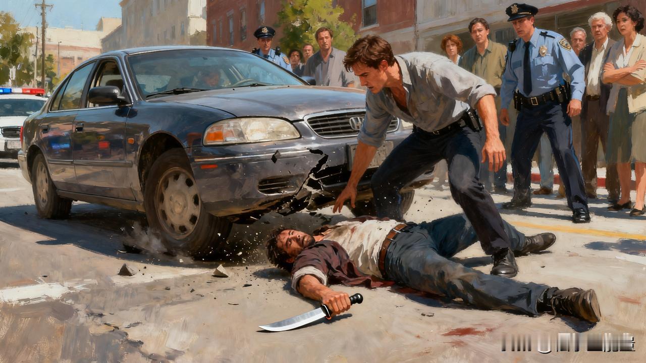 男子驾车勇撞持刀歹徒 街头突发险情,一歹徒持刀行凶。危急时刻,路过男子果断驾