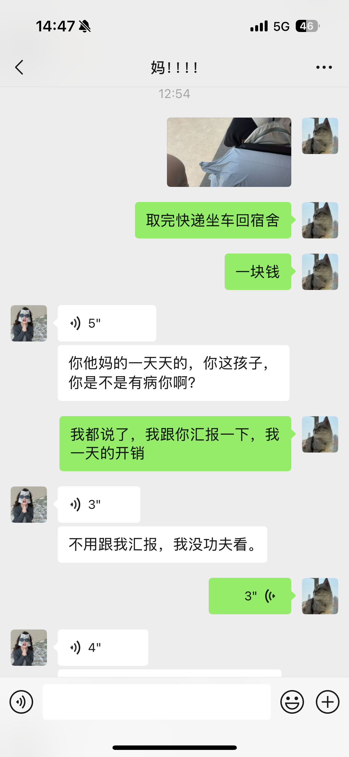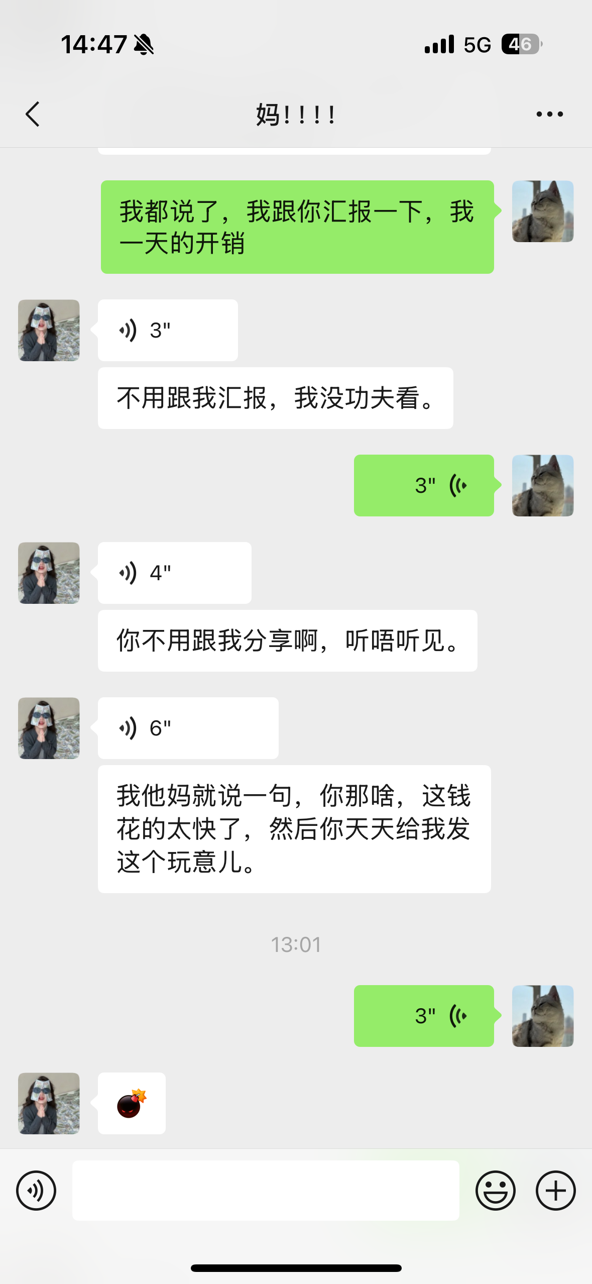我妈非得说我乱花钱,我给她分享我一天开销她还说我我有病,下午还没分享呢,居然玩拉黑我,我不会放弃的。