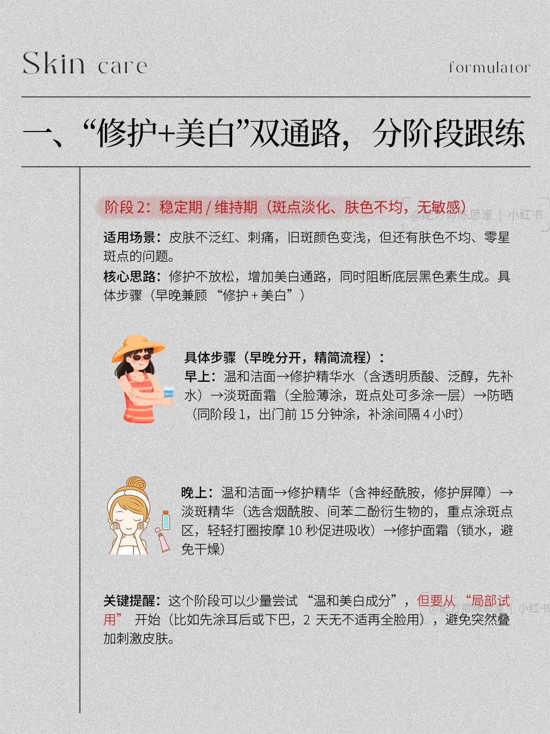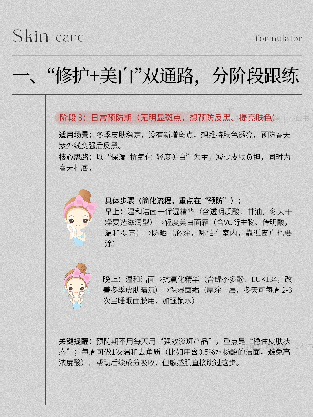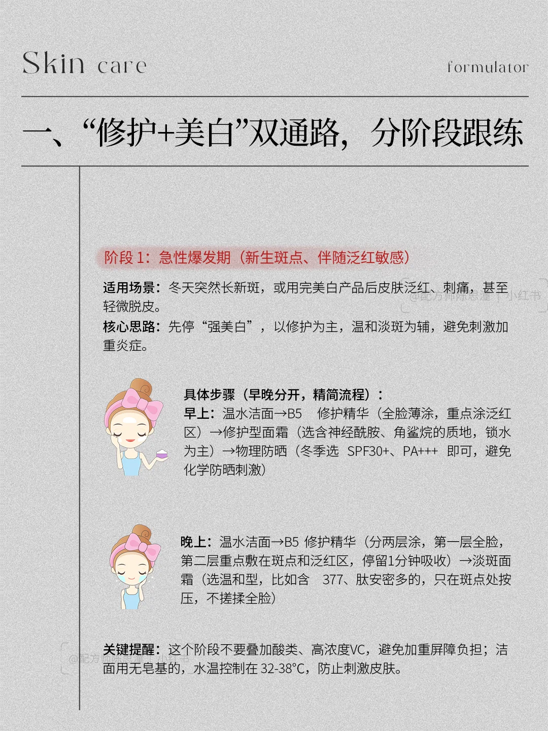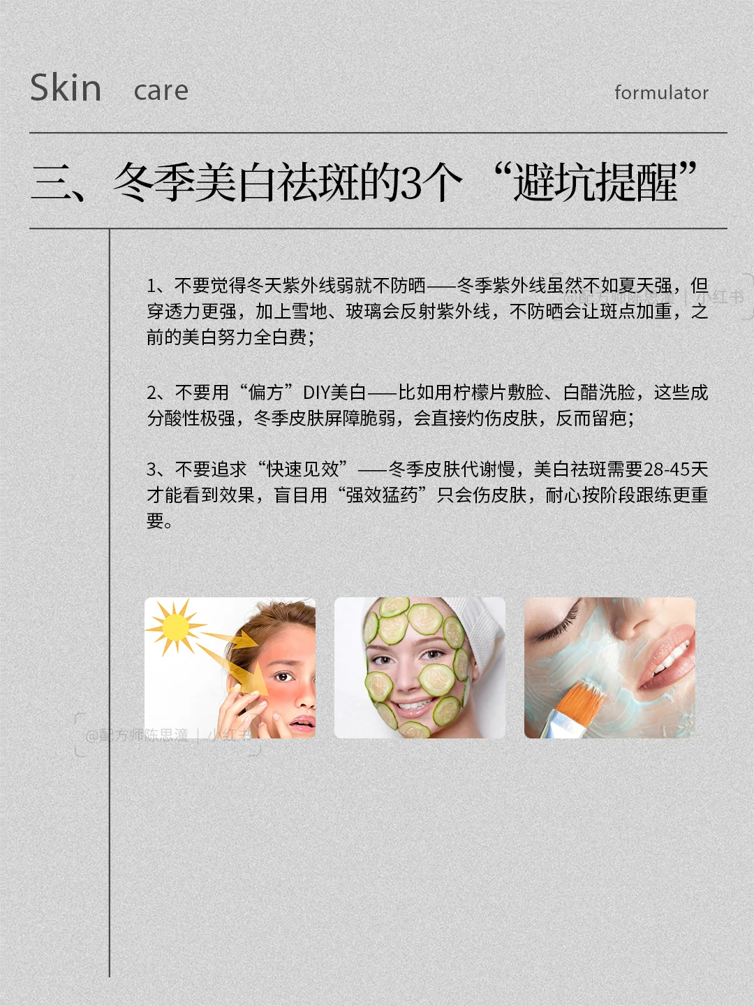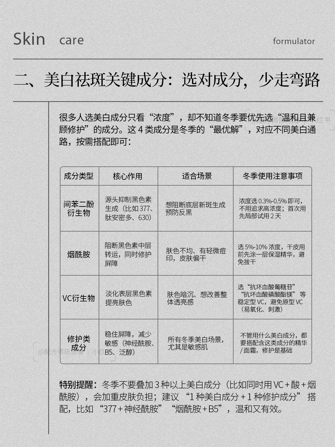 冬季美白祛斑的核心,从来不是“猛堆美白成分”,而是“先适配皮肤状态,再精准发力”! 很多人冬天用高浓度 VC、酸类美白没效果还烂脸,本质是忽略了冬季皮肤屏障的耐受阈值 —— 低温干燥会让角质层含水量下降、屏障功能减弱,此时盲目 “强攻” 黑色素,无异于在脆弱的皮肤上 “强拆”,不仅会引发敏感泛红,还会刺激黑色素细胞代偿性活跃,反而让斑点更顽固。 今天不聊空泛理论,只分享的可跟练方案,不用死记硬背,跟着步骤来,就能避开冬季美白的反黑、烂脸坑,稳妥淡斑提亮~