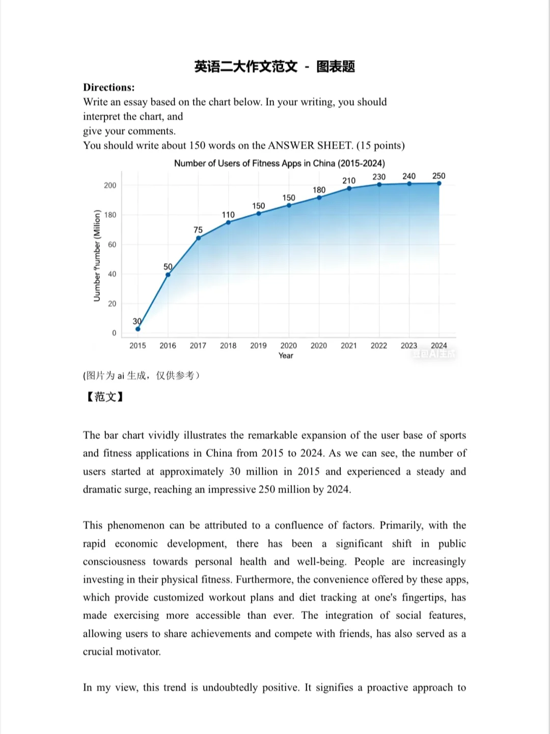 - 出题形式:图表作文。图表可能涉及运动健身App用户规模、健康食品消费市场等数据的增长趋势。