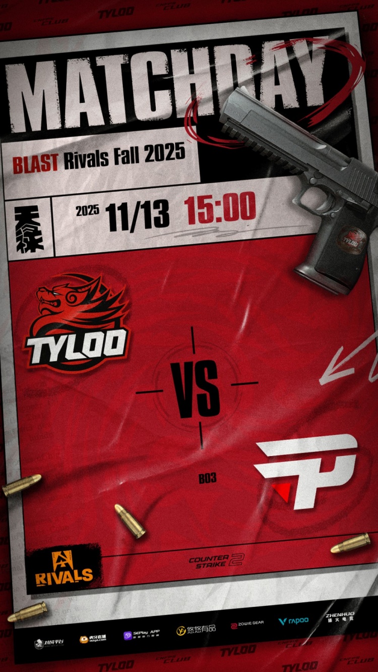 直播吧11月13日讯BLASTRivalsFall来到第二日,中国战队TYLOO在败者组的对手是巴西队伍Pain,输者将被淘汰!