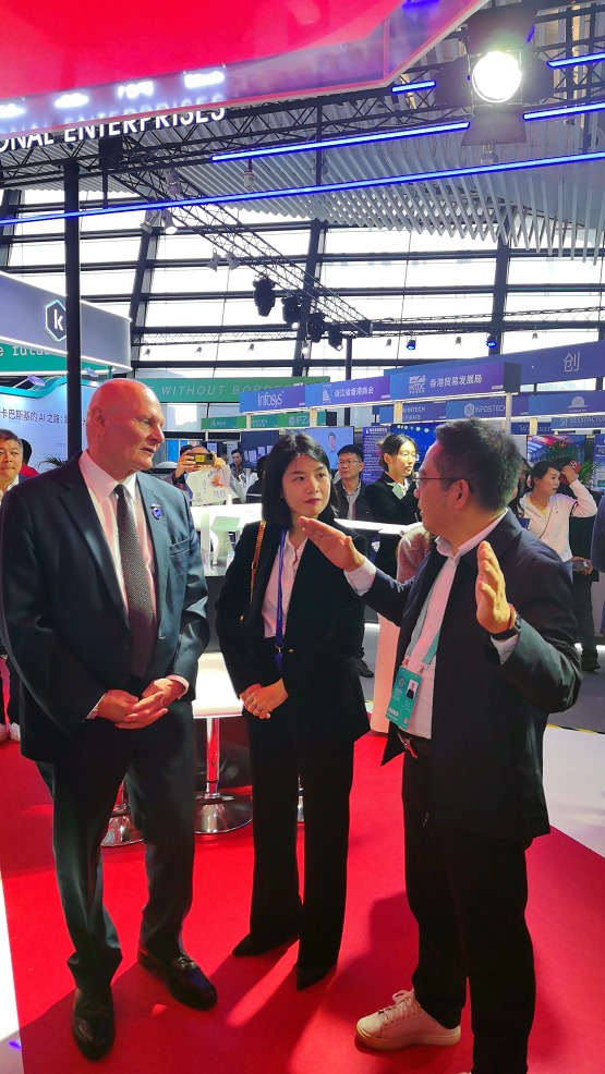 (星际航总经理徐文向GSMALtd.首席执行官JohnHoffman介绍星际航区县2.0产品)