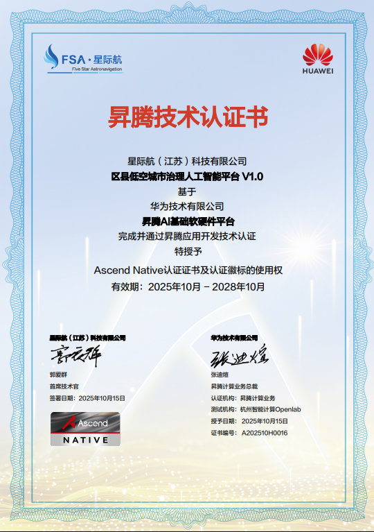 (星际航区县低空城市治理人工智能平台V1.0获得华为昇腾AI技术认证)