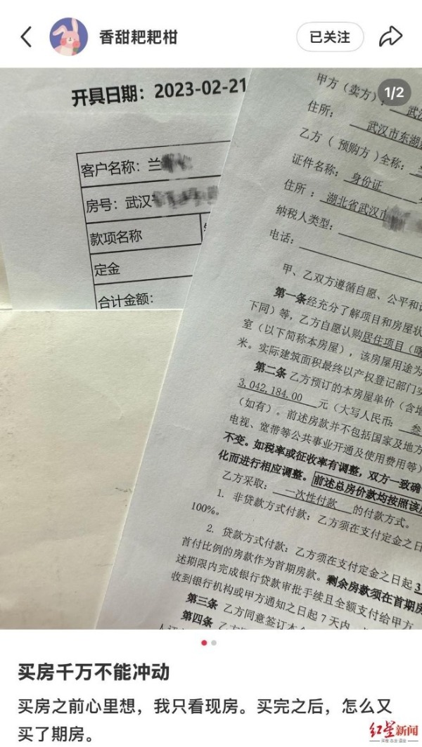 红星新闻记者对比其在个人社交平台发布的多条动态发现,2023年5月31日,@香甜耙耙柑晒出的购房合同信息显示,其所购房产总价确为300万元左右,且房产也的确位于武汉市东湖新技术开发区(即武汉光谷),客户名称处显示该客户姓兰。