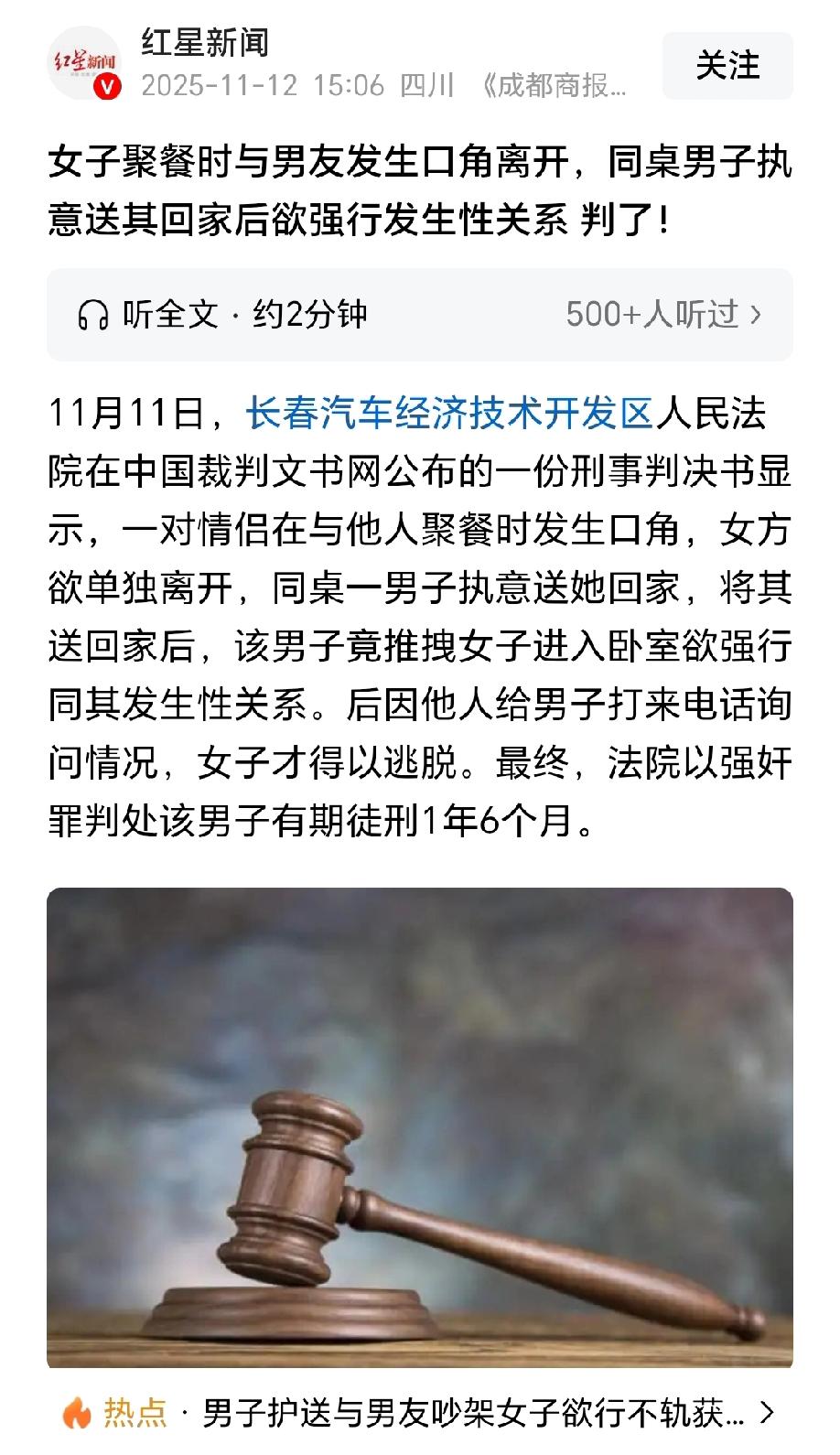 酒后乱性?吉林长春,女子和男友及男友的朋友一起聚餐时,两人中途发生口角,女子一气之下打车回家。一起聚餐的男子提出要送女子回家,遭到拒绝后,他还是厚着脸皮把女子送回房间。孤男寡女共处一室,男子色心大起,想要强行和女子发生关系,好在朋友及时打来电话,让男子悬崖勒马。事后,女子果断报警,男子被刑拘。 男子蔺某出生于1992年,他和张某、李某是好朋友,闲来无事就喜欢一起聚个餐,侃侃人生。 谁能想到,一次酒后乱性,竟然让蔺某走上了违法犯罪的道路,朋友之间的情谊也烟消云散。 2025年7月5日晚上8点多,蔺某又约上朋友聚餐,这次,李某还带着女友黄女士一起出来,介绍给朋友认识认识。 大家一边吃一边聊,气氛还算融洽。可到了次日凌晨3点左右,李某和黄女士因为一点小事突然起了口角,两人还越吵越凶。 黄女士看着男友当着朋友的面和她争吵,实在太丢面子,一气之下就叫了辆网约车准备离开。 这时,蔺某的心里打起了坏主意,他嘴上说着要送黄女士回家。黄女士心里清楚蔺某那点心思,根本不想让他送,明确拒绝了他。 可谁知,蔺某就像没听见似的,执意上了网约车,还坐在了黄女士旁边。 在去黄女士家的路上,蔺某越来越放肆,居然用手去触摸黄女士的腿部。黄女士吓的身体都僵硬了,赶紧把蔺某的手推开,还大声呵斥他,让他别乱来。 然而,蔺某根本不管,脸上还露出那种让人恶心的笑容。 到了黄女士家楼下,黄女士心想终于到了,赶紧摆脱这个家伙。她再次明确拒绝蔺某,让他别跟着自己。 但没想到,蔺某就像块狗皮膏药,紧紧跟着黄女士上了楼,还强行进了她家。 一进家门,蔺某就原形毕露,强行搂抱、亲吻黄女士。黄女士拼命挣扎,大声呼喊,可家里就她一个人,根本没人能帮她。 蔺某还不罢休,推拽着黄女士就往卧室走,想强行和她发生性关系。 黄女士心里害怕极了,觉得自己今天可能逃不出这个恶魔的手掌心了。就在她绝望的时候,张某的电话打了过来,询问蔺某这边的情况。 这电话就像救命稻草一样,黄女士趁机挣脱了蔺某的控制,赶紧跑到楼梯口,然后通知男友李某报警。 蔺某看到黄女士跑了,还报了警,心里又慌又怕,知道自己闯大祸了,赶紧逃离了现场。 没过多久,民警找到蔺某,直接戴上手铐把他带走了。 被抓后,蔺某这才后悔莫及,当时不知怎么鬼迷心窍,闹到违法犯罪的地步。 为了弥补自己的过错,蔺某让亲属帮忙给黄女士代为赔偿4万元,黄女士看到蔺某的态度诚恳,收钱后也给蔺某出具了谅解书。 蔺某的酒后乱性,不过是他自私与恶念的遮羞布。酒精或许会麻痹神经,却不会让人丧失基本的道德判断,真醉到失控的人,连站都站不稳,哪还有力气去侵犯他人? 蔺某这样拿酒当借口,不过是借着醉意,把平日里压抑的龌龊念头释放出来,事后还想用“喝多了”来逃避责任,实在可耻。 “朋友妻不可欺”,这是底线,更是人伦。蔺某连这份信任都拿来践踏,把魔爪伸向朋友的伴侣,那便连做人最基本的良知都丢了。 做人,得守住底线,别让酒遮了眼,别让欲迷了心,否则,必将面临法律的严惩和道德的审判。 因此,黄女士的谅解并不意味着蔺某可以免责,这一行为已经涉嫌犯罪,检察机关依法对蔺某提起公诉。 依据《刑法》第236条规定:以暴力、胁迫或者其他手段强奸妇女的,处三年以上十年以下有期徒刑。 法院审理认为,蔺某违背黄女士的意愿,采用暴力、胁迫的手段试图强奸黄女士,构成了强奸罪,依法必须惩处。 虽然蔺某已经着手实施强奸,但因为张某打电话询问情况,这才给了黄女士趁机逃离的机会。 而且蔺某到案后如实供述自己的罪行,自愿认罪认罚,亲属又代他赔偿了被害人,取得了被害人谅解,依法可以从宽处理。 《刑法》第23条规定:已经着手实行犯罪,由于犯罪分子意志以外的原因而未得逞的,是犯罪未遂。对于未遂犯,可以比照既遂犯从轻或者减轻处罚。 法院调查认为,蔺某是因为害怕才停止犯罪行为,是意志以外的原因没得逞,属于强奸未遂,可以比照既遂犯减轻处罚。 最终,法院以强奸罪判处蔺某有期徒刑1年6个月。 蔺某做梦也想不到,一时的冲动,最终却会锒铛入狱,付出这么惨重的代价。 男子护送与男友吵架女子欲行不轨获刑