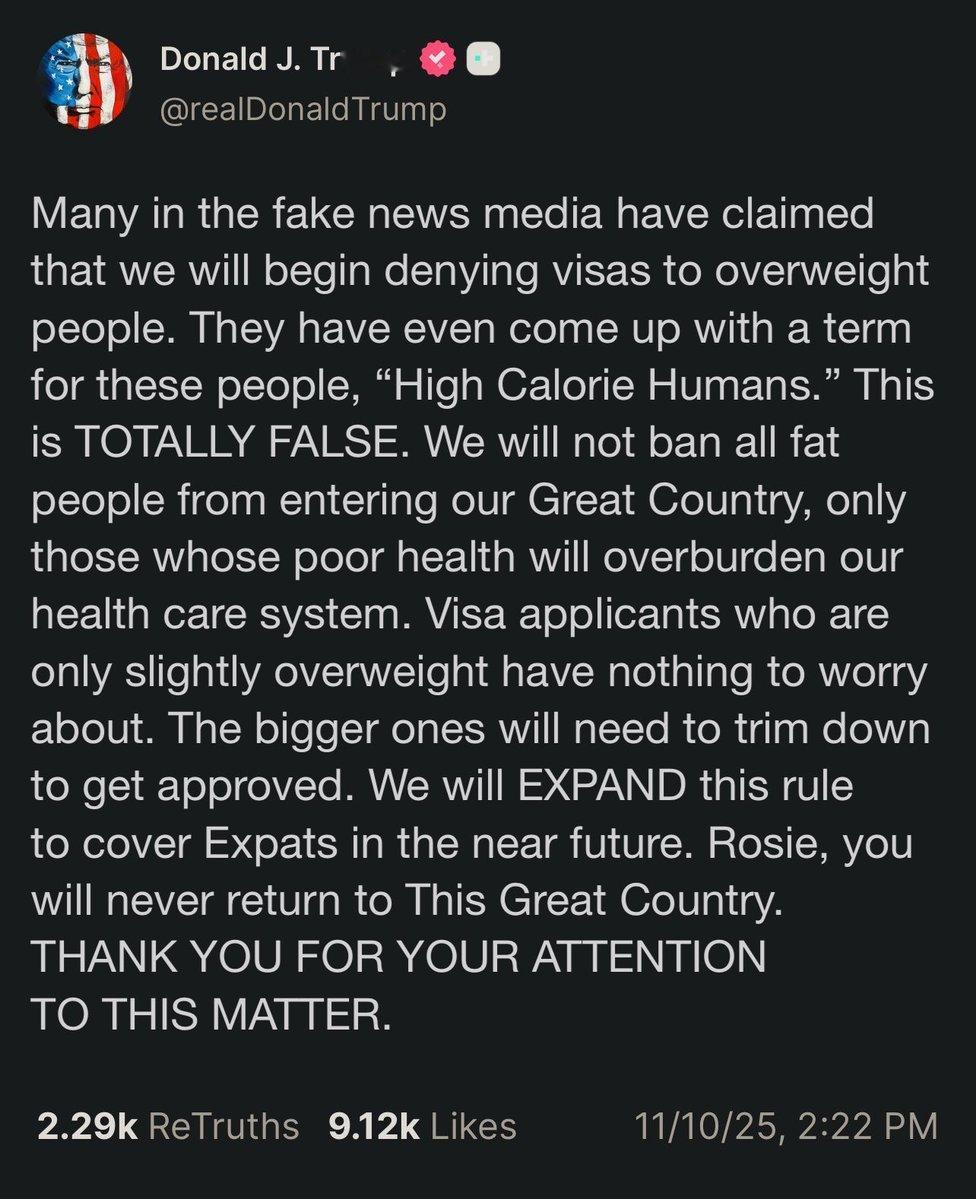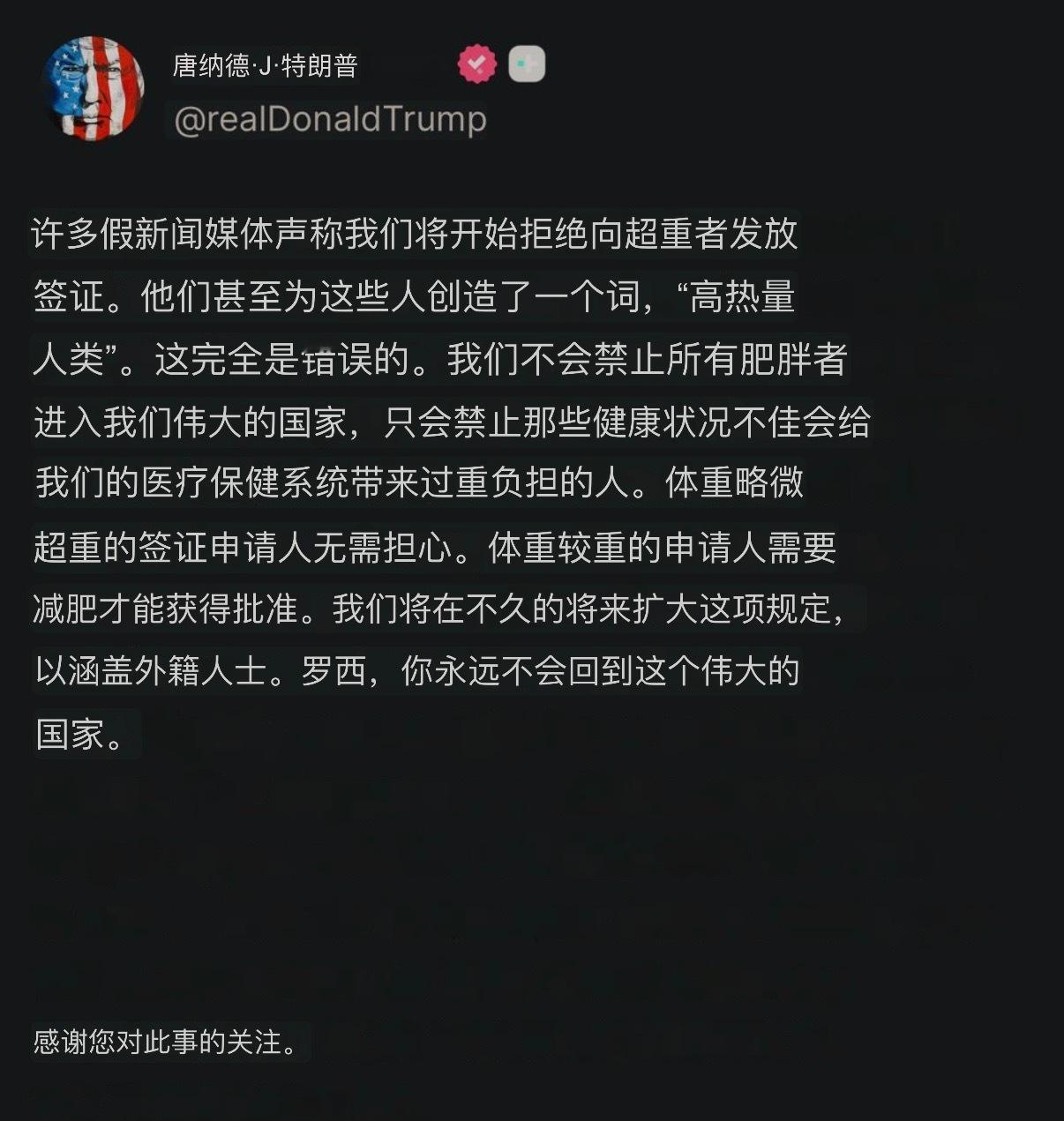 🔻特朗普政府正指示签证官员拒绝肥胖人士和有高昂医疗问题的人入境,理由是这些人可能会给美国医疗体系和纳税人带来负担。🔻?🔻有一出是一出的太抽象了。
