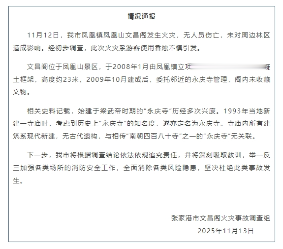 张家港市凤凰山文昌阁发生火灾,官方通报:系游客使用香烛不慎引发