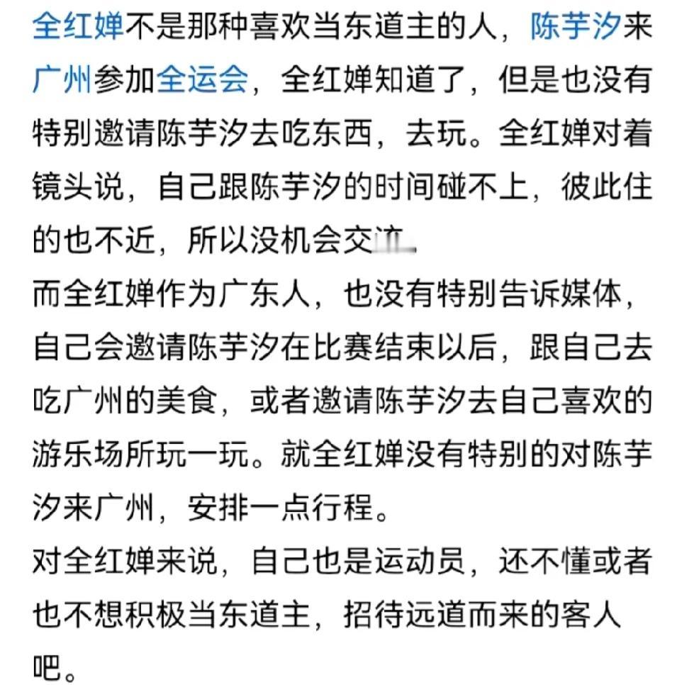“全红婵被冤枉了!”陈芋汐来广州参加全运会,婵宝没请她去逛吃逛,有人说她情商太低,没心机! 要我说,看热闹不嫌事儿大,这真的是太冤枉我们婵宝了! 1.大家知道,从湛江到广州是400公里左右,全红婵很少在湛江,除了寒暑假,其它时间几乎都在训练场,估计她对广州都不熟。 婵宝14岁时,她自己也说过,之前连动物园都没去过,她可能也不知道要到什么地方去游玩! 2.她们两个训练时间也不在一个段,再说了,婵宝已经是带伤比赛了,上楼梯都要扶着怎么带小陈到处跑呢? 3.要知道他队里组织性纪律性是很强的,大家各人有各人的集体行程安排,他们不能自由出行,自由吃喝的。 4.婵宝如果只请陈芋汐,其它人要不要请呢?跟全红婵关系要好的有很多,请谁不请谁?所以是个有点麻烦的问题 另外,婵宝如果做东,这也会让广东其它队员有压力,比赛如果在其它省市,当地的选手作不作东? 所以,婵宝不是情商低,而是情商高,同事之间太复杂反而不好,反而简简单单相处更舒服,大家怎么看?