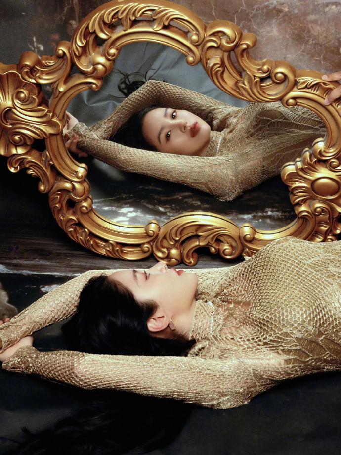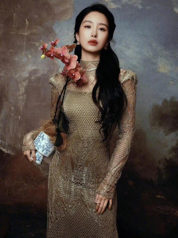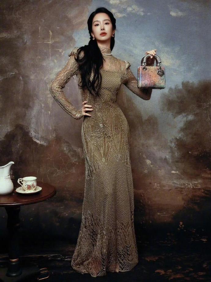 杨采钰DIOR LADY ART 10艺术家限量合作大片,仿佛油画中走出来的少女。身着高级的咖绿色镂空连衣长裙,搭配珍珠项链和慵懒半扎发。优雅感十足,姐姐美的轻而易举呀