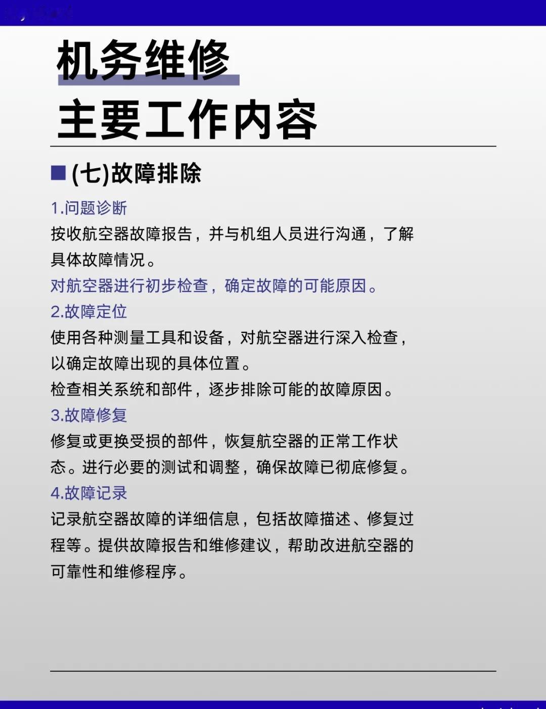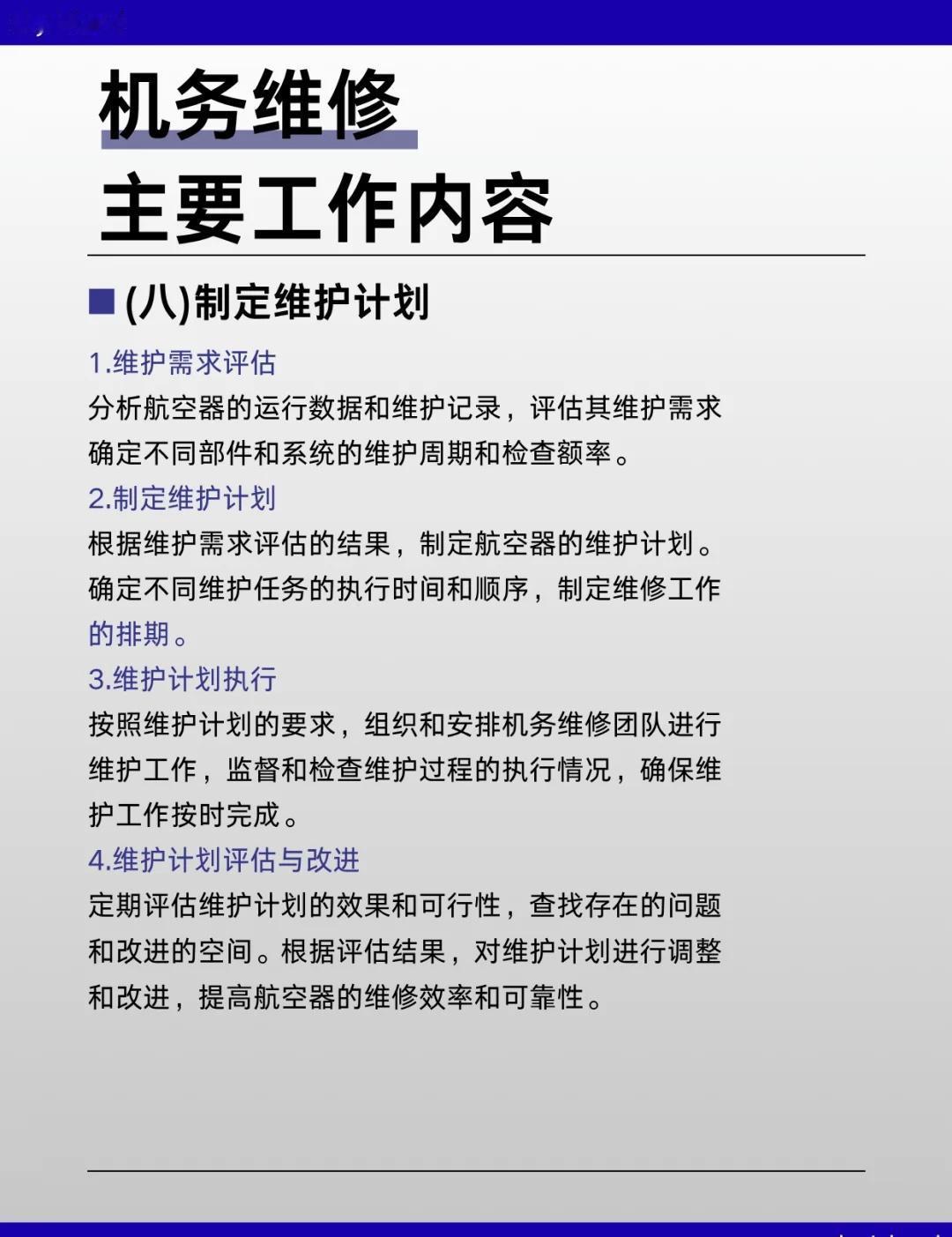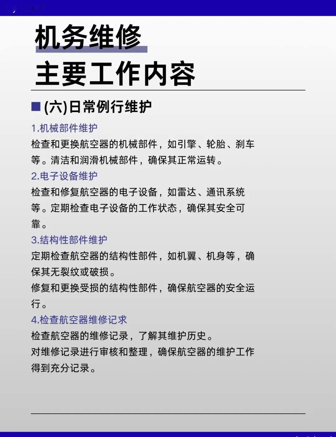 机务维修主要工作内容 (一)航线维修工作 (二)定检维修工作 (三)维修计划和控制 (四)故障分析和排除 (五)质量管理和安全管理 (六)日常例行维护 (七)故障排除 (八)制定维护计划 机务维修是一项技术性强、责任重大的工作,需要工作人员具备扎实的专业知识和丰富的实践经验。 机务维修 机务维修工 机务维修岗 飞机维修 飞机维修员