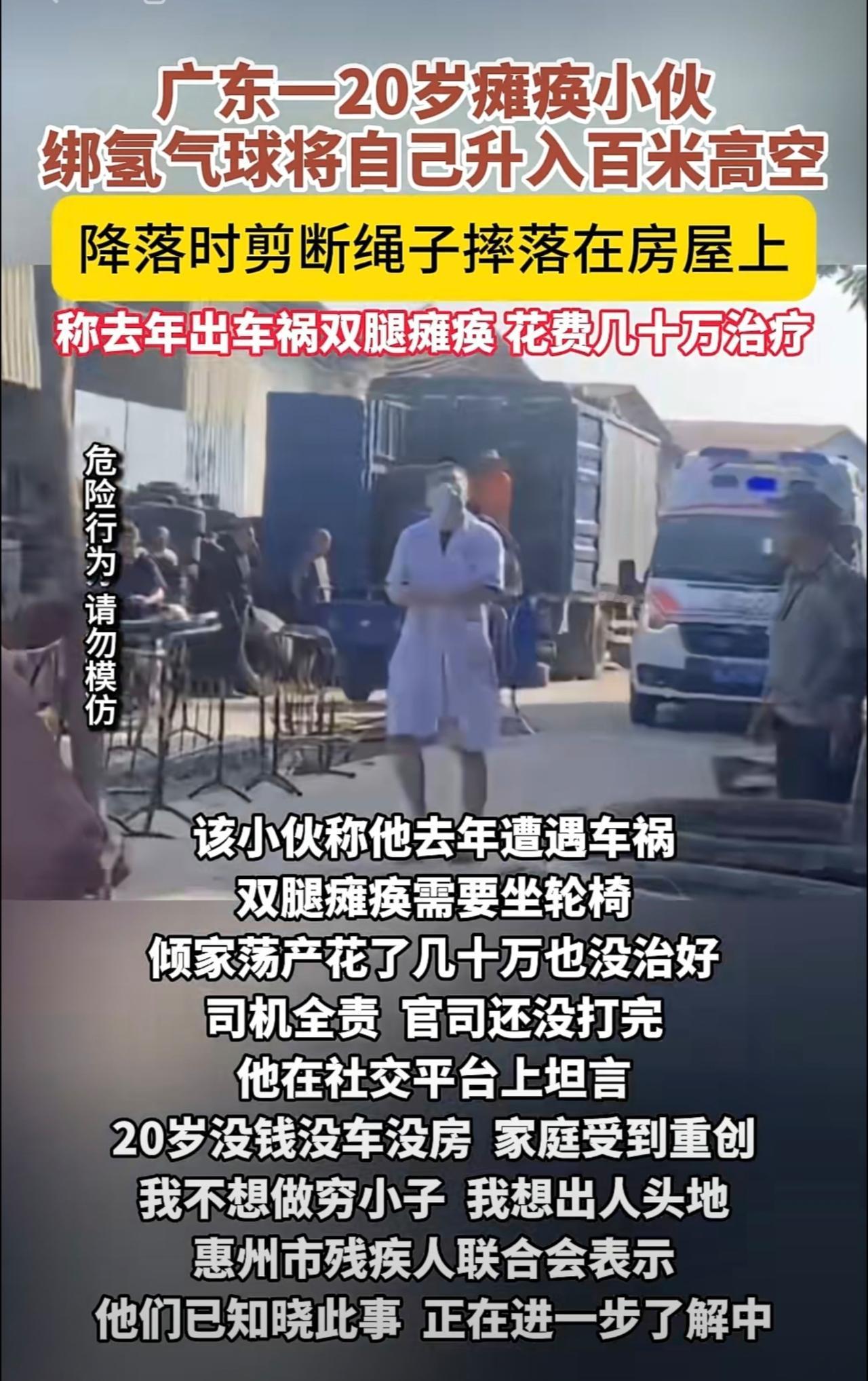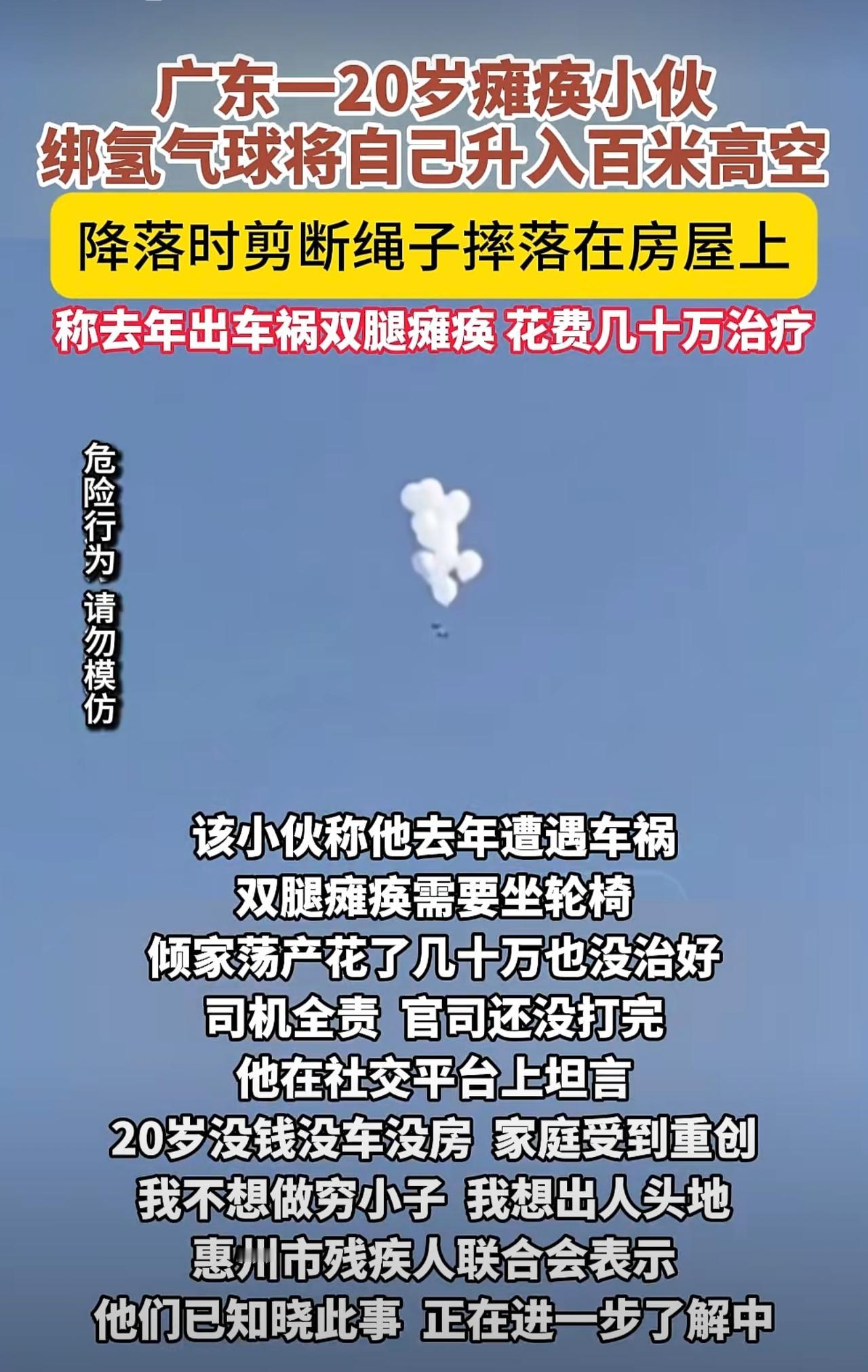 广东一20岁瘫痪小伙绑氢气球将自己升入百米高空。(潮新闻)