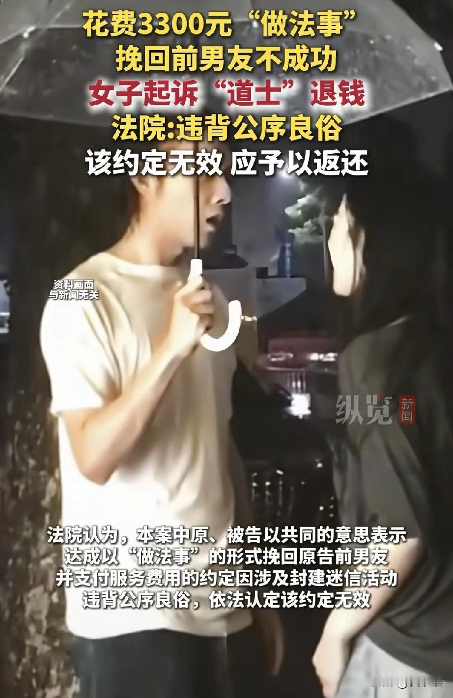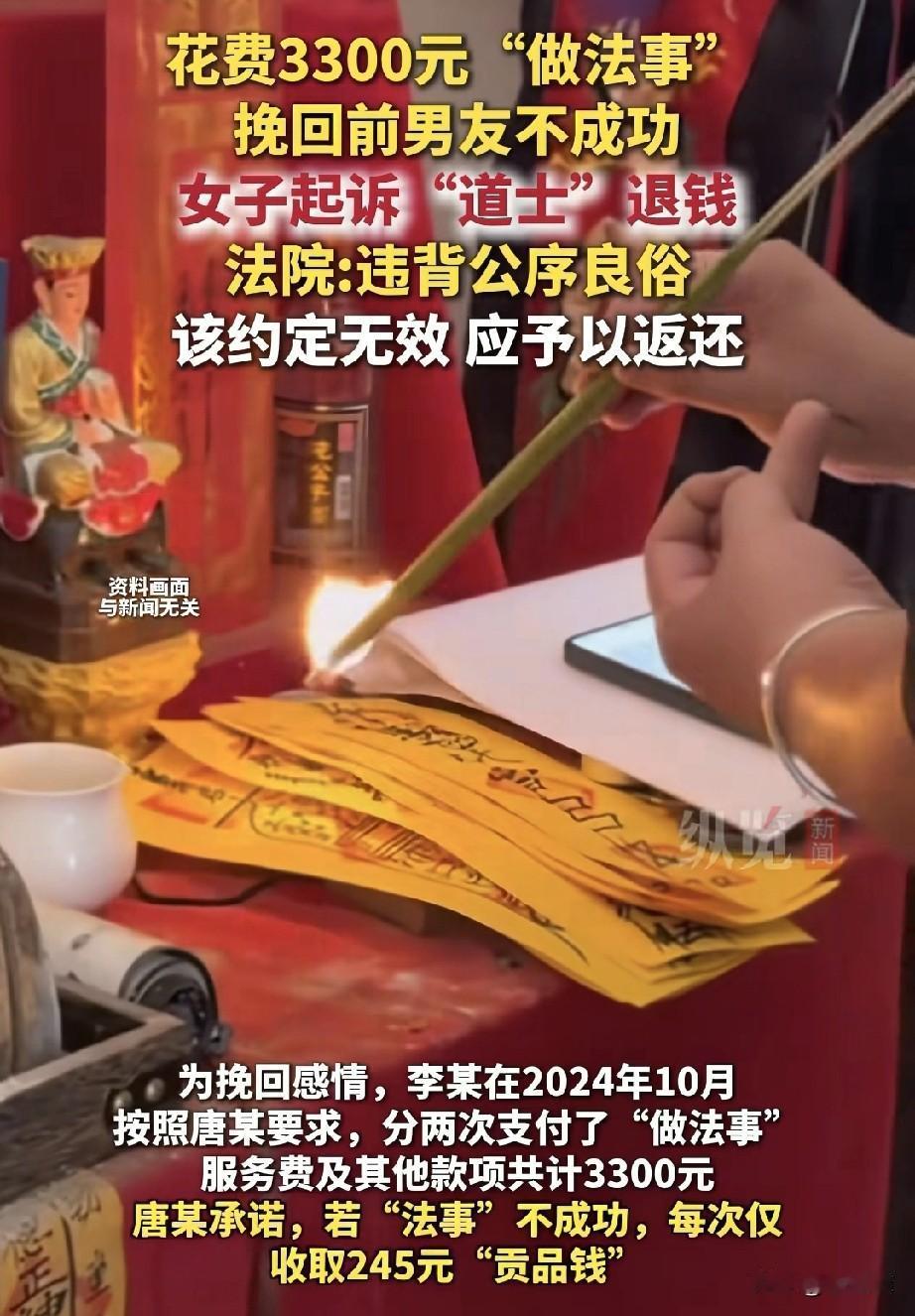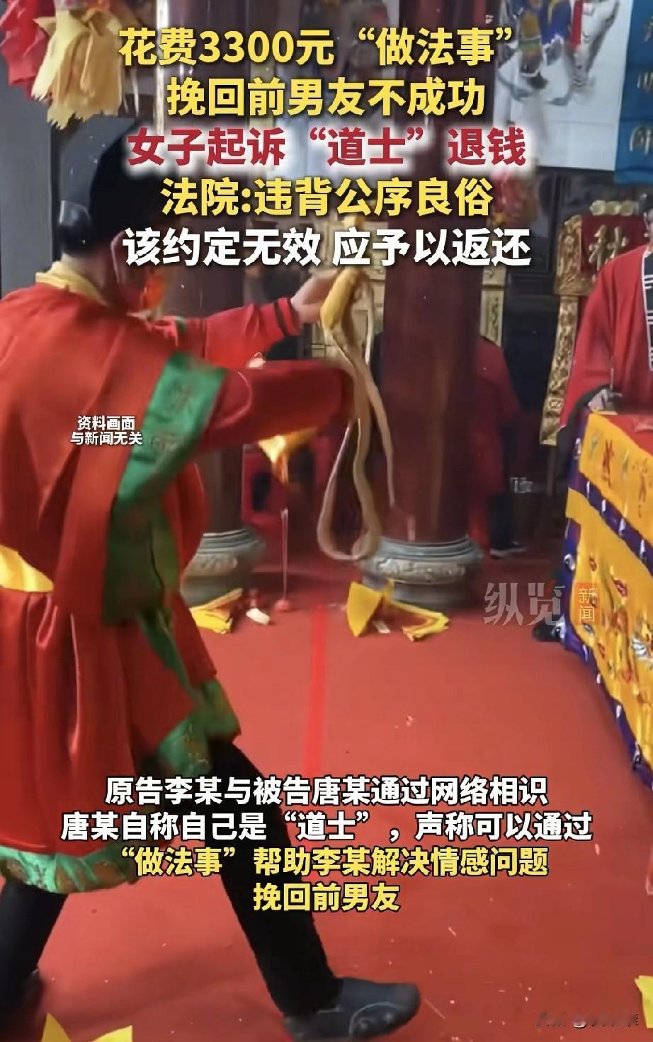 “拜错了神仙!”女子李某因感情不和与男友分手,分手后,李某想挽回这段感情,却被男友拒绝。后来她通过网络认识了一位自称“道士”的唐某,唐某信誓旦旦的声称能通过“做法事”解决李某的感情问题,让其前男友回心转意,为了挽回逝去的爱情,李某一时冲昏了头脑,分两次向唐某转账3300元,唐某保证:如果达不到预期效果就只收245的“贡品钱”,李某对这位道士的话深信不疑。然而法事做完后并没有给李某的感情带来任何起色,前男友依然对她不理不睬,更别提回心转意了。 此时醒悟过来的李某要求唐某退还自己支付的3300元,而唐某仅仅退还给了她75块钱。 气急败坏的李某将唐某告上法庭,法庭审理认为,两人的行为属于封建迷信,违反了公序良俗,属于无效交易。判决唐某返还女子李某的剩余款项! 我想说:“这女子脑子不好使啊,怪不得男友不愿意和她复合!” (事件参考:2025年11月12日,潇湘晨报 ,晨视频等多家媒体报道。)