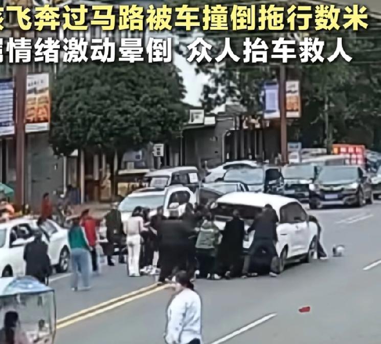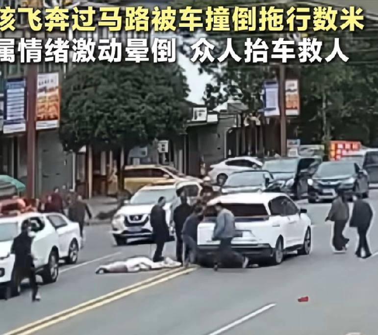小孩飞奔过马路被车撞倒拖行数米,家属情绪激动晕倒,众人抬车救人 双黄线横穿马路,