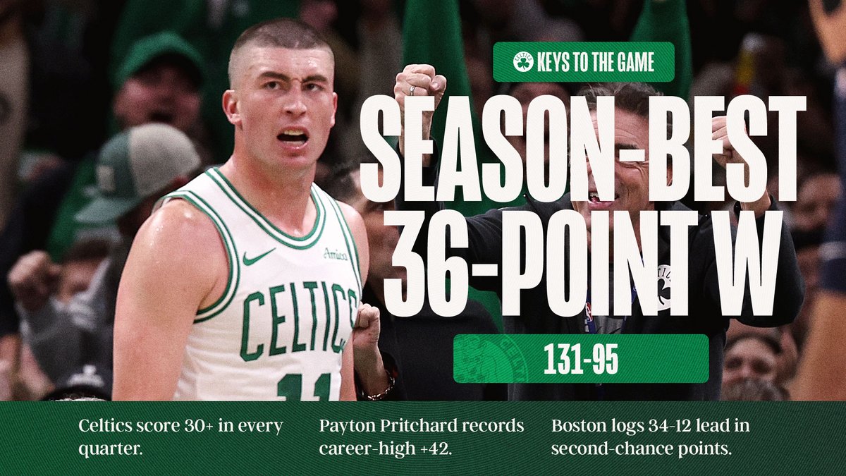 凯尔特人今日净胜对手36分,刷新了赛季新高。
