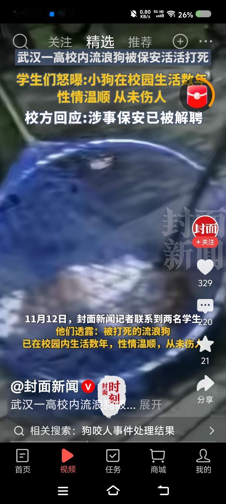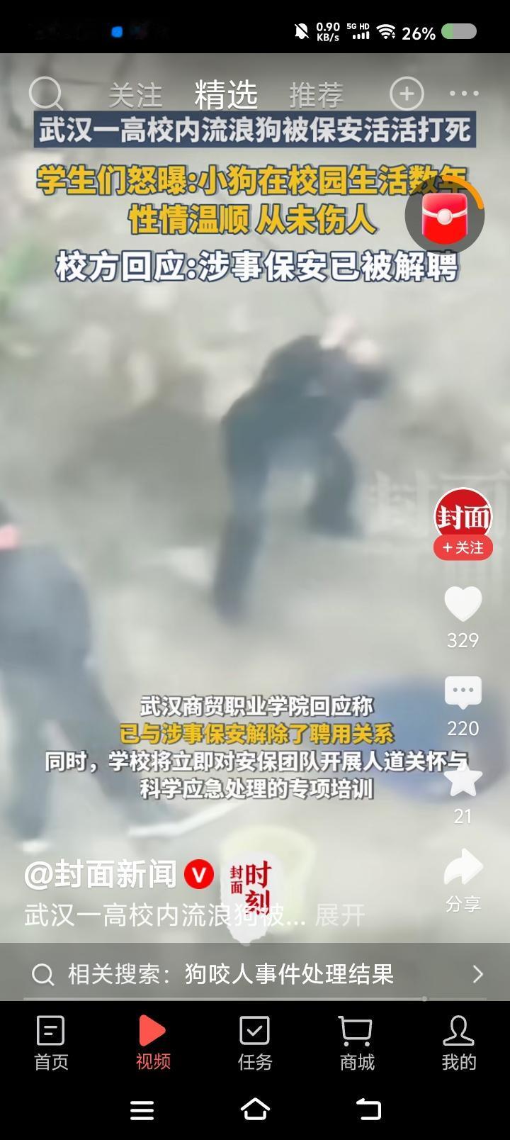 保安错在哪里?—— 据报道,某校园保安将一流浪狗打死,遭曝光,被解雇。学生反映狗很温顺。 点评: 咱不清楚保安当时的心理,不好评判。许多网友批评保安。 如果保安出于维护安全考虑,我提几个问题: 一、狗的温顺与否,谁说了算? 二、校园内流浪狗咬伤了人,受害者和学校是否追究保安责任? 三、即使它温顺,但有学生怕狗,怎么办?他们有权在无狗的校园里上课。 只有一个问题:公开打死,手段过于残忍,可以驱离。