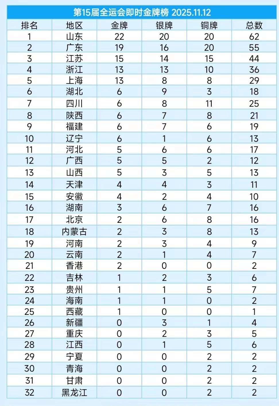 2025第15届全运会即时奖牌榜 第一名山东已经遥遥领先了总奖牌62个了。金牌22个,银牌20个,铜牌20个,不得不说山东在体育这方面实在是太牛了。 山东队金牌含金量比广东队含金量要高,因为广东队是东道主! 黑、甘、青、宁,江西你们几个省努力努力,期待本届全运会取得好成绩。 从金牌榜想起了一句话,穷文富武这句子有一定的道理。希望后面的往上赶赶,不要差距太大了。