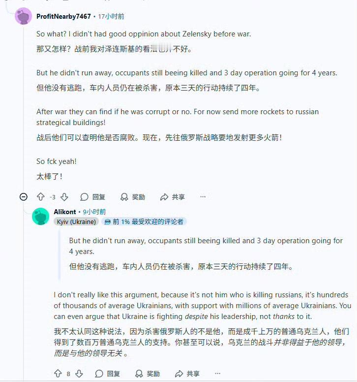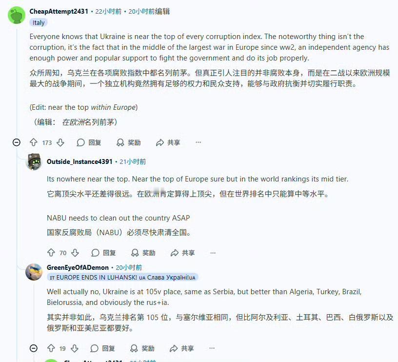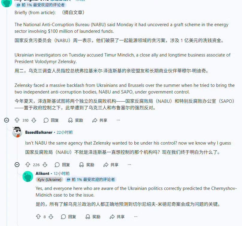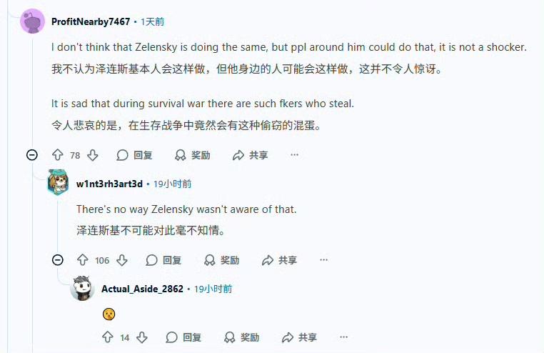 泽连斯基要被清算了?乌克兰反腐机构指控泽连斯基的亲信侵吞一亿美元公款,有可能牵连到泽连斯基。 看点不在这件事本身,而是欧美人对这件事的看法,典型的就是reddit上的评论。 前几天报道刚出来的时候,谁敢发这个消息,求谁就被扣俄罗斯间谍的帽子。 结果今天乌克兰反腐机构官宣了。 reddit上的高赞评论好玩了: 图三:“怪不得泽连斯基想要控制国家国家反腐败局” 图四:“都是下面的人干的,泽连斯基被蒙蔽了” 图五:“我早就知道泽连斯基不是好人,但只要能杀俄罗斯人就是得支持” 图六:“乌克兰的反腐败机构居然可以和总统对着干,说明乌克兰确实民主先进”