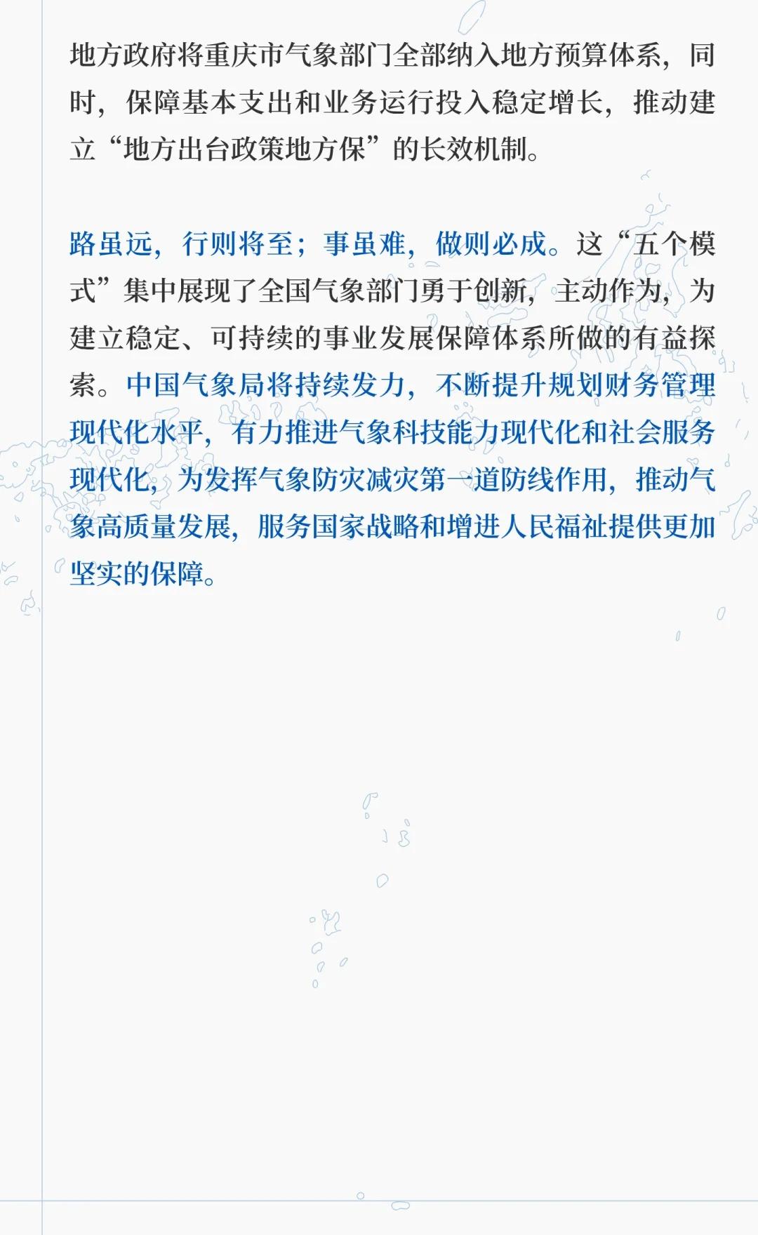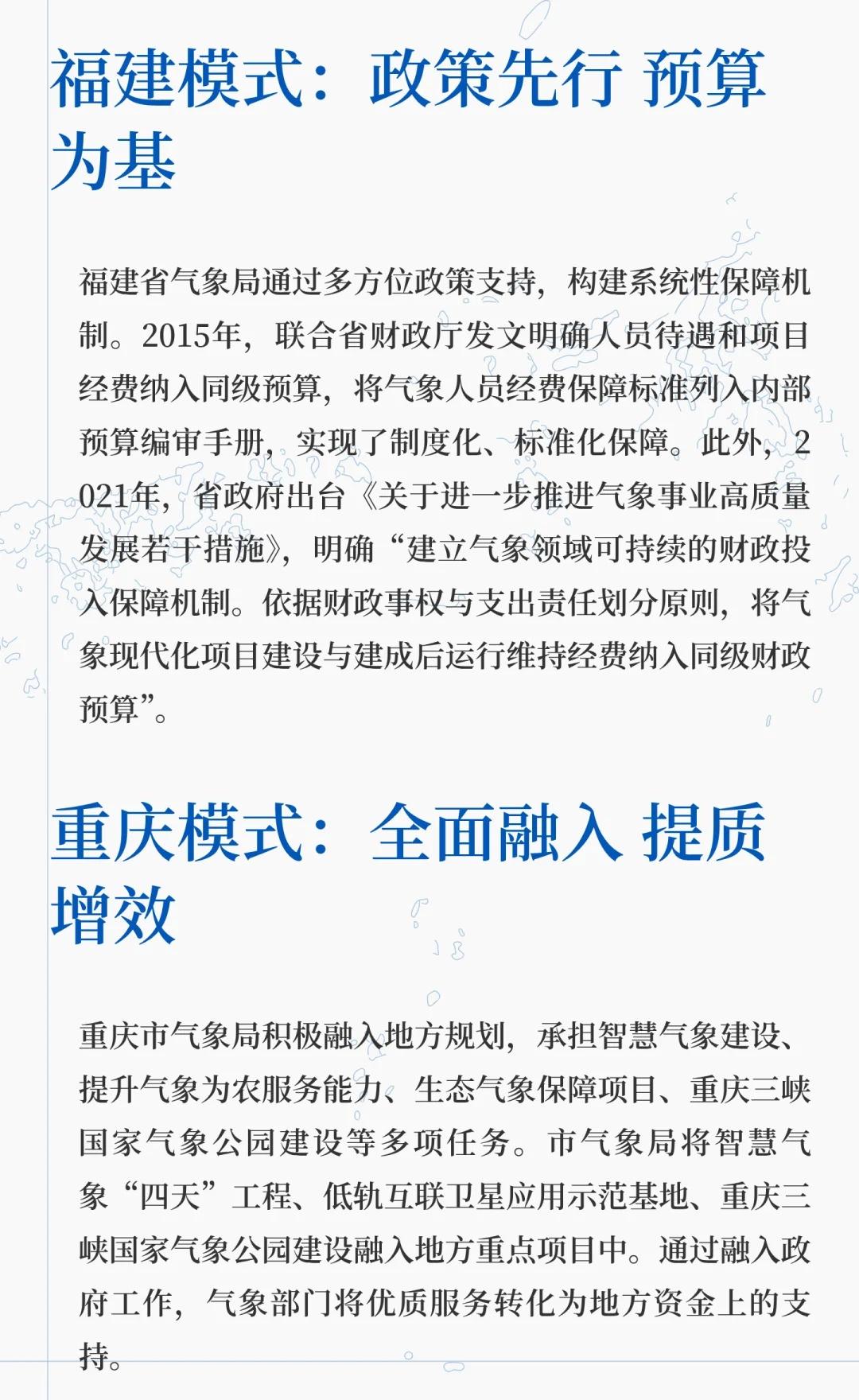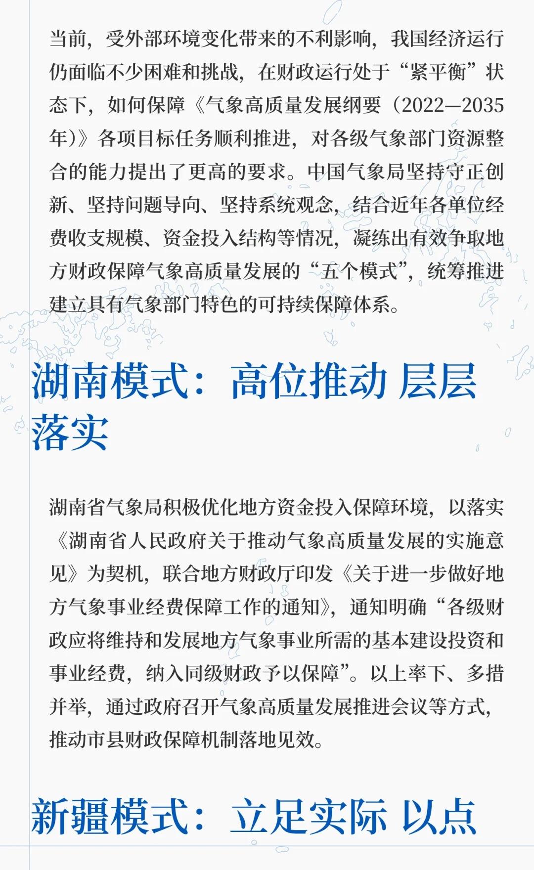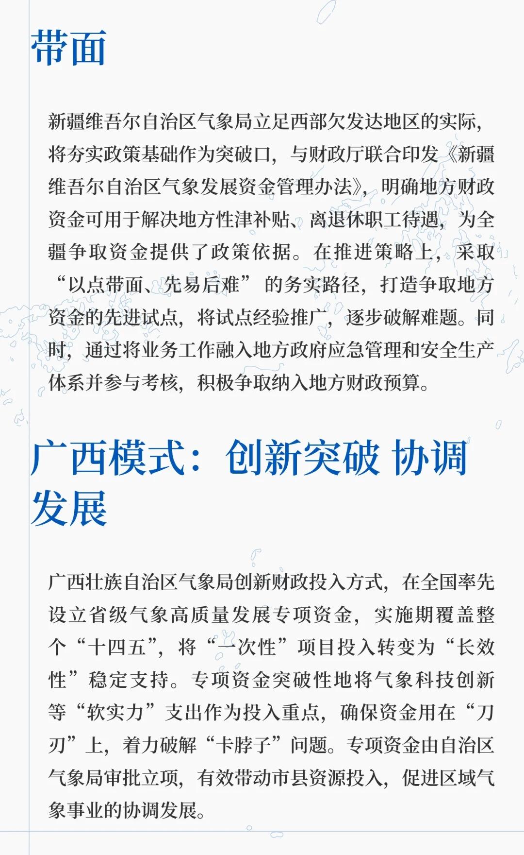 五省创新“五大模式” 保障气象高质量发展 为保障《气象高质量发展纲要》目标实现,所凝练出的地方财政保障“五个模式”。✔️湖南通过高位推动、联合发文明确经费保障责任;✔️新疆立足实际,以政策突破和试点推广争取资金;✔️广西创新设立省级专项资金,强化长效支持与软实力投入;✔️福建构建政策体系,实现人员待遇和项目经费的制度化保障;✔️重庆则通过全面融入地方重点项目,获得稳定预算支持。这些模式展现了气象部门主动作为、因地制宜的创新实践,为建立可持续的气象事业发展保障体系提供了有益探索,将持续为气象高质量发展奠定坚实基础。气象面试 江苏气象面试 气象局面试 气象热点 气象热点素材