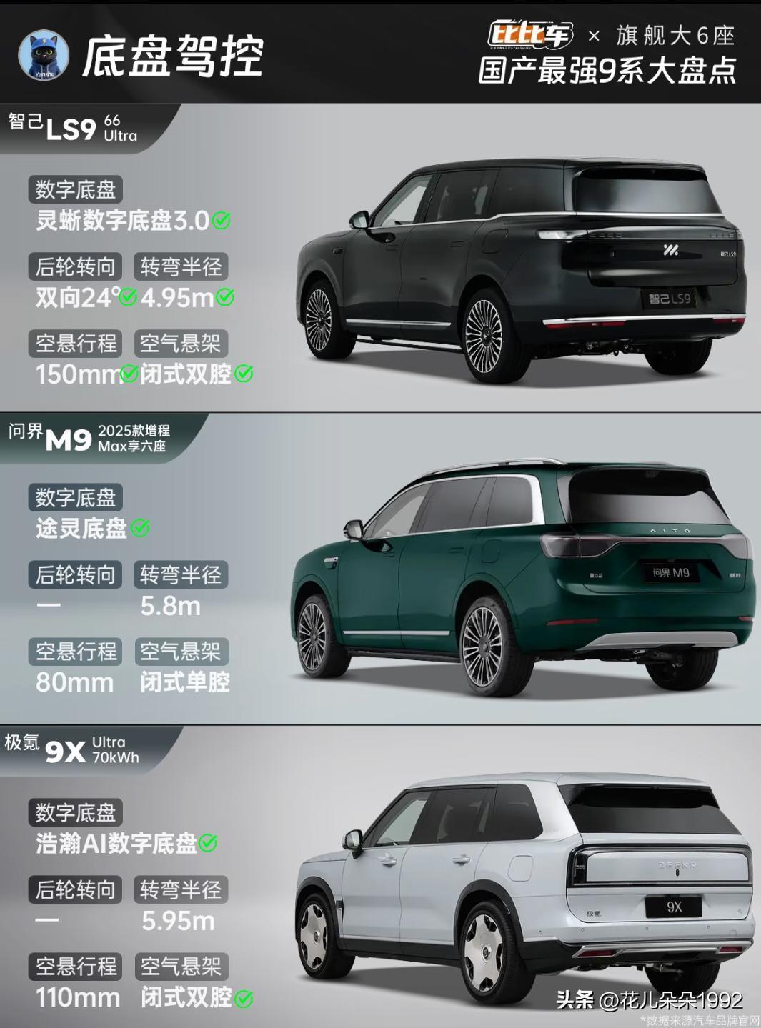 三款国产9系大6座SUV。 双向24度后轮转向搭配灵蜥底盘3.0,LS9