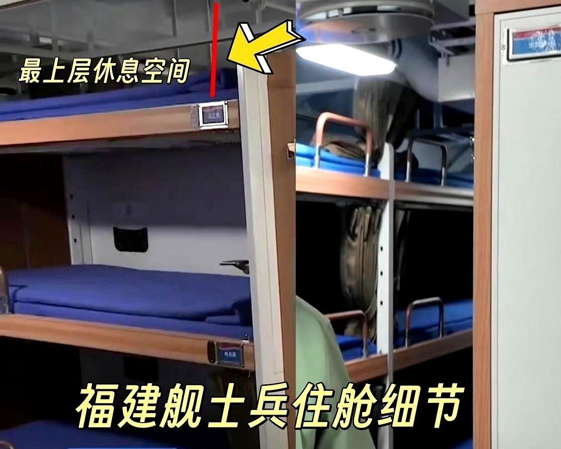 刷到福建舰士兵住舱的图,我愣了半天。上铺,离天花板40厘米。这是什么概念?我躺在家里一米八的大床上,都觉得缺了点啥。人家的小伙子,在海上,在咱们最牛的航母上,睡觉的空间就这么点儿。 一开始心里挺不是滋味,觉得咱们国家这么强了,航母都造得出来,为啥不能让战士们睡得更舒展点,后来才琢磨明白这根本不是钱的问题而是战斗力的选择,航母的每一平方米都金贵得像市中心的地皮,得多装燃油多带弹药多停战机,睡觉的地方紧凑点是为了把空间让给更重要的装备。 这就好比咱们普通家庭买房,面积有限就得精打细算,客厅要大卧室小点也能忍,福建舰就是把这道理用到了极致,战士们缩起腿弯个腰睡觉,换来的是一架架歼15能顺利起飞,是一枚枚导弹能稳稳待命,这种取舍背后是一笔明白账。 再看看其他国家航母的水兵住舱,美国尼米兹级航母的兵舱很多也是三层铺,床铺宽度也就80厘米左右,俄罗斯库兹涅佐夫号条件更艰苦些,可见这不是咱们独一份而是全球航母的通用设计逻辑,战斗力优先这条铁律放哪儿都一样。 那些二十岁出头的小伙子们,把自己青春里最舒展的那部分压缩在这40厘米高度里,他们放弃的不是舒适而是用身体丈量出国家安全的边界,我们能在岸上安心点外卖刷视频,正是因为有人在海上替我们扛住了风浪。 这话糙理不糙,那小小的卧铺看着憋屈,实际上托起的是一个大国的底气,每一寸被节省下来的空间都化作了守护海疆的力量,这些年轻人挤着睡觉却让十四亿人能踏实地躺着过日子。 各位读者你们怎么看,欢迎在评论区讨论。