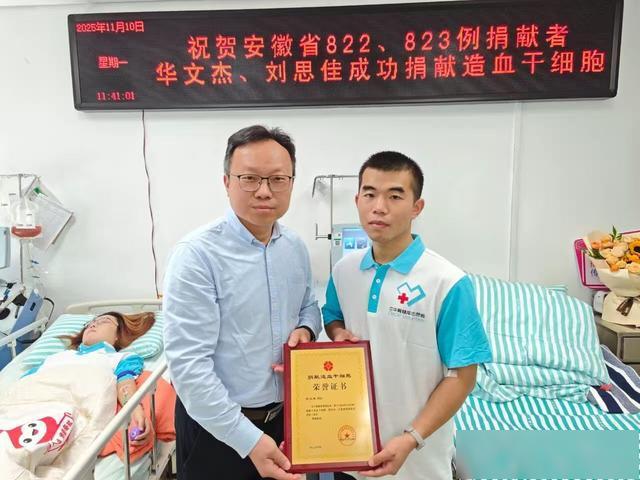 这是一场历时六年的生命之约,这是一次跨越山海的生死接力。11月10日,在安徽省立医院的采集室里,216毫升造血干细胞混悬液如同珍贵的生命火种,从“00后”现役军人华文杰的体内缓缓采集,将为一位素不相识的血液病患者重燃生命之光。华文杰成为了安徽省第822例、蚌埠市第30例造血干细胞捐献者。