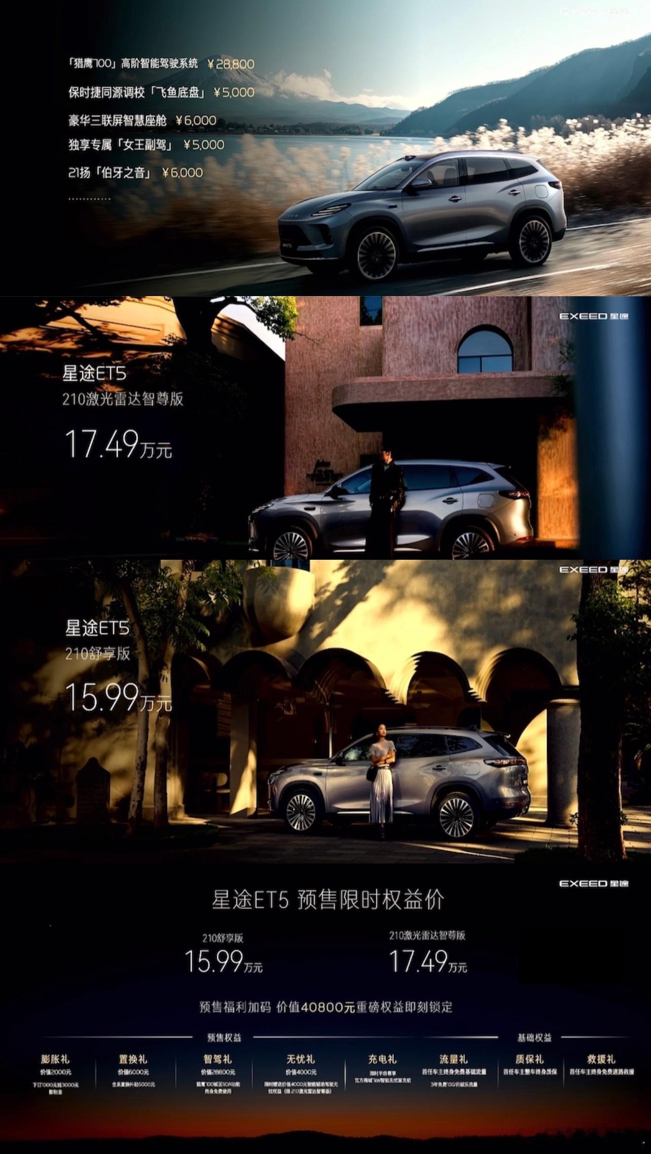 星途 ET5 的预售价是15.99万、17.49万,关注这台车基本上都是看高配带