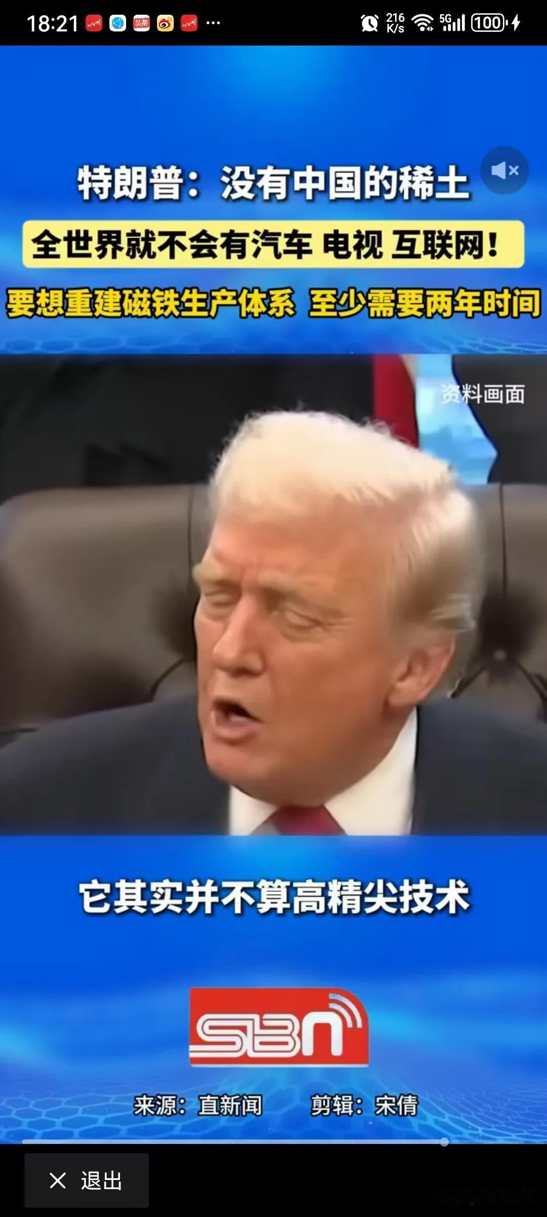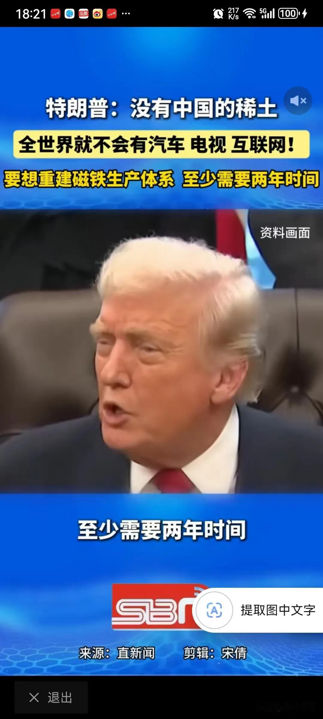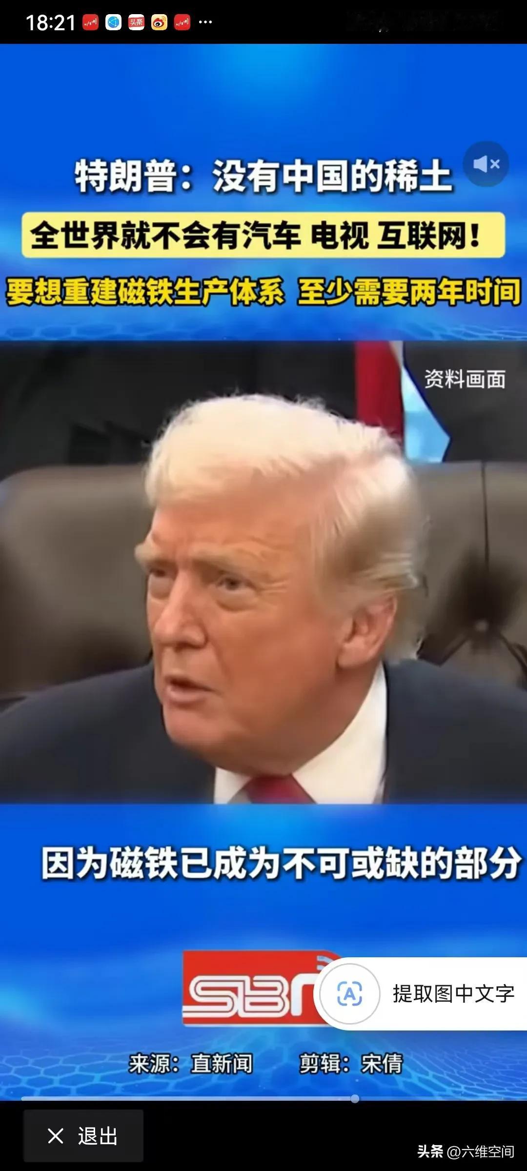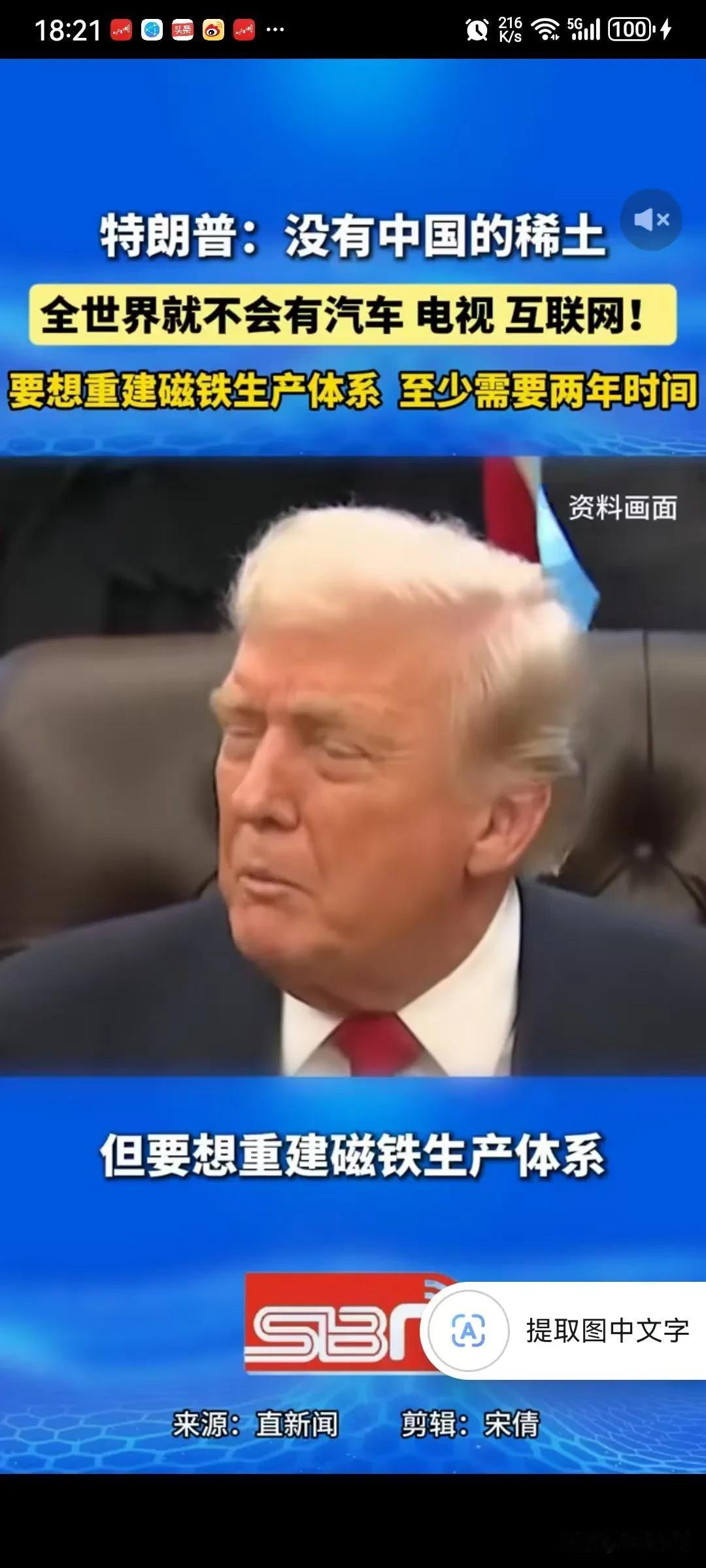 川普称没有中国的稀土,这个世界的一切会停摆,整个西方都造不了车,互联网也会瘫痪,川普称中国在稀土的地位太强了,是过去32年累计出来的结果,所以中国的稀土左右着整个西方的高端制造,现在别无选择,只能和中国买稀土才不会破产倒闭,但是川普也强调稀土技术并不是什么高精尖的技术,只是美国重建稀土产业链需要两年而已,所以川普让西方不要害怕,等美国两年!其实两年很快的,看到时候川普被怎么打脸了!