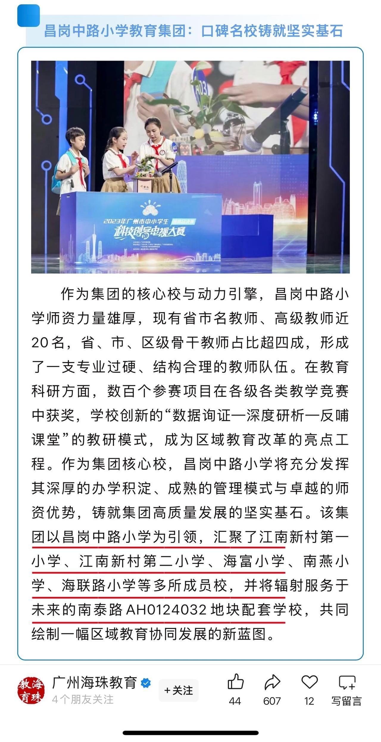 【官宣】南泰路AH0124032地块配套学校由昌岗中路小学领办,作为区属公办学校独立开办,并纳入新成立的昌岗中路小学教育集团,计划在未来3年开办。 该集团以昌岗中路小学为引领,汇聚了江南新村第一小学、江南新村第二小学、海富小学、南燕小学、海联路小学等多所成员校,并将辐射服务于未来的南泰路AH0124032地块配套学校,共同绘制一幅区域教育协同发展的新蓝图。 火:我的解读和分析如下, 一、划重点 ❶南泰地块的学校确定为省一级的昌岗中路小学。 ❷海富小学确定加入昌岗中路小学教育集团。 二、为什么要单独拧“海富小学”出来讨论呢? 因为海富小学就在南泰地块规划的“中小学教育用地”范围内。此前,有关渠道已明确海富小学不会拆掉。 目前,海富小学仅有18个教学班,与“南泰地块将配建一所27班小学”的传闻只相差了9个班。 所以,在课室数量未达标的情况下,海富小学大概率会在原有的位置上进行扩建。 再结合今天【广州海珠教育】的新闻——海富小学正式并入昌岗中路小学教育集团。 那我当初的分析预测很可能会成真了,即:海富小学将会进行全面升级,最终改名为“昌岗中路小学(某某校区)” ps:这个“某某”,可以是“海富”,也可以是“南泰”,更可以是未来新楼盘的名字。 三、海富小学的前身 ❶它是成立于1973年的江南大道南小学(简称:江南南),后于2002年5月8日(周三)搬迁至海富花园内新校址并更名为【海富小学】。 ❷江南南小学与海富小学的合并,不仅提高了教育设施的利用率,也进一步丰富了海珠区的教育资源,为学生提供了更优质的教育环境。可见,合并是“利大于弊”。 所以,海富小学本来就有过成功合并的经验。接下来再与昌岗中路小学合并,都是驾轻就熟。 四、昌岗中路小学(南泰校区)何时开学? ❶如果以“现有海富小学为班底”的思路来讲,则它已经开学了。 ❷如果以“官宣计划”的思路来讲,则未来三年就会来办。 关键词是“三年”,我不妨推算一下: 【第一年】2025年11月至2026年10月 【第二年】2026年11月至2027年10月 【第三年】2027年11月至2028年10月 但小学不可能在10月份才开学,换言之,昌岗中路小学(南泰校区)最快会在2028年9月投入使用。 五、利好谁? 我之前写过、分析过,具体请点击链接阅读。 以上的分析和预测,仅为我个人观点,一切要以实际情况为准。