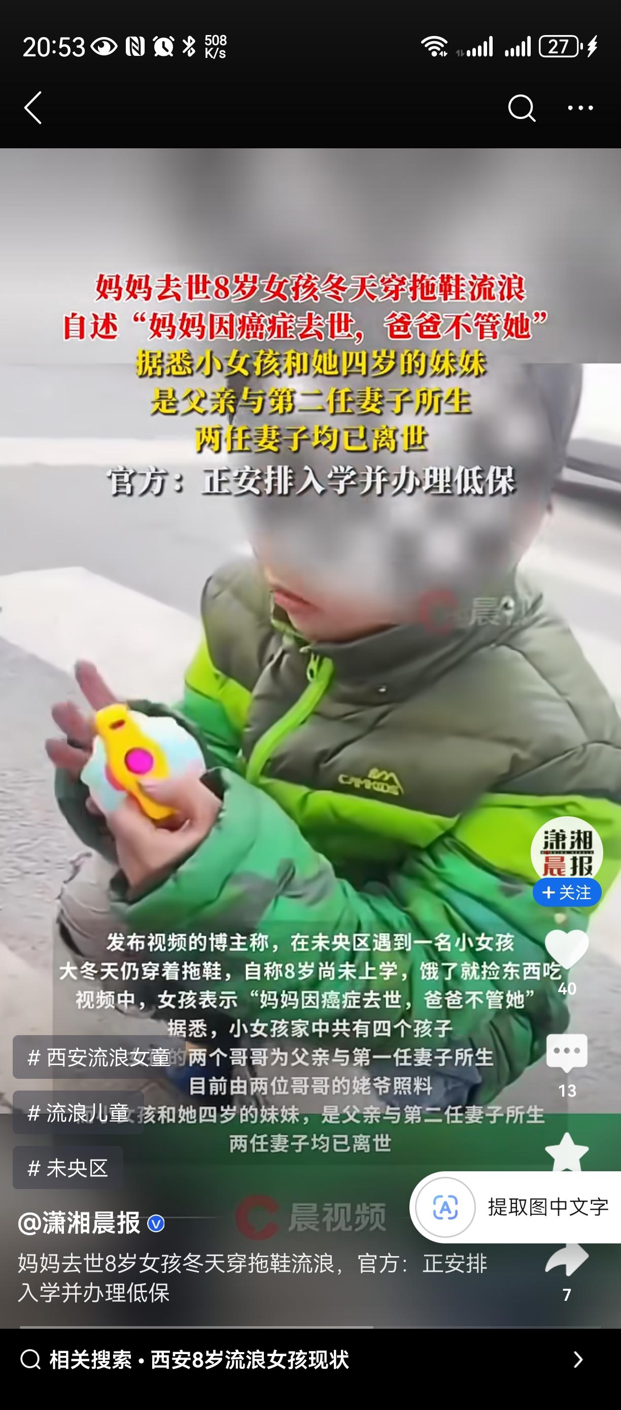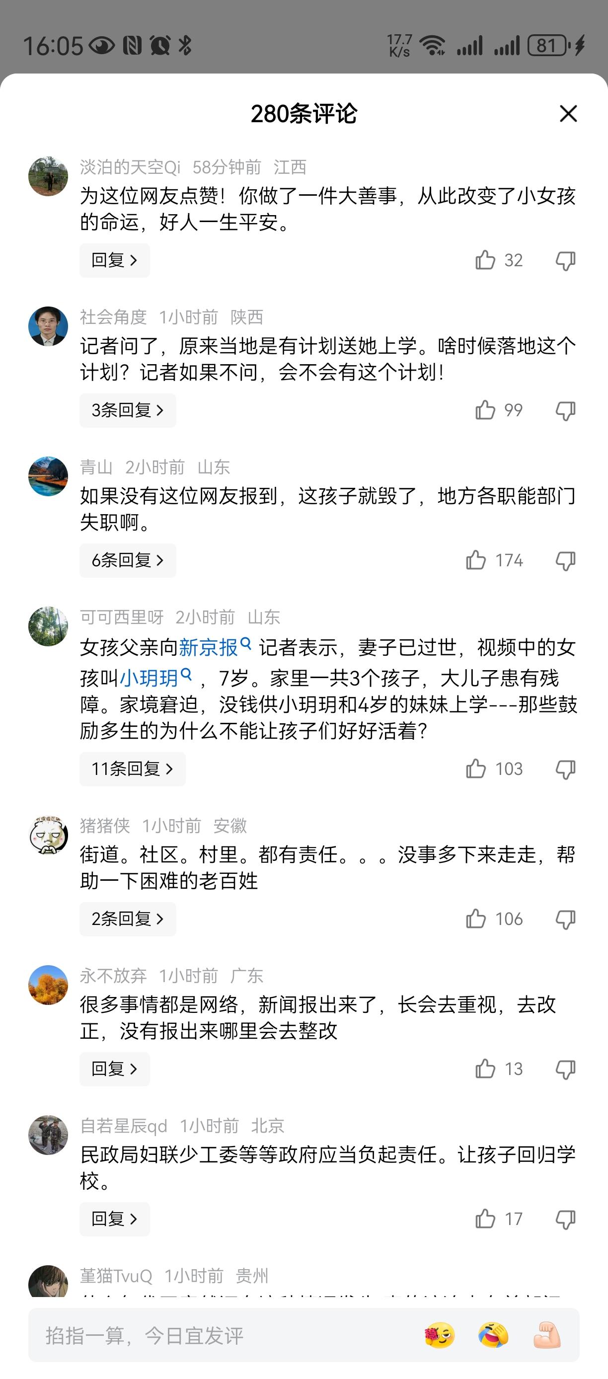 感谢网络[祈祷][祈祷][祈祷] 希望能改变这个苦命小女孩及其妹妹的命运吧。。 也不要一直说追责晒一张相册里的天空吧 虽然一年级没去读老师不问吗? 这种家庭没享受低保吗?太可怜的小孩 可怜的娃加油啊 感谢这个曝光的好爸爸, 有温情有良心[赞][赞][赞][强]