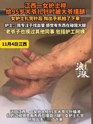 11月4日报道,江西,一个女护士,正在给一个95岁的大爷扎针,她认真寻找大爷的血管,却感觉大腿有东西在动来动去,她害怕伤着大爷了,坚持给大爷扎完针才看大腿,结果看到了不可思议的一幕,大爷竟然用手指触碰她的大腿,女护士拍了视频,给其他女同事和护工阿姨看,结果她们也被大爷摸了。 江西一所医院的住院部里,护士小吴(化名)最近经历了一件让人又气又委屈的事,她在工作中遭遇了不当触碰,而让人更震惊的是,这并不是孤例,科室里多位女性同事都遇到过同样情况。 小吴推着治疗车去给张大爷(化名)输液。这位95岁的老人卧床近一年,身体算硬朗,说话清楚、认人也正常,但血管细,扎针得特别小心。 小吴站在床边,一手扶着大爷手腕,一手拿着针头轻轻拍打找血管,眼睛紧盯着手背,生怕扎偏让老人受罪。 正当针头快要扎进血管时,小吴突然感觉右大腿有东西在蹭,痒痒的,像被轻轻摩挲。 她下意识以为是被子滑下来,可低头一看,毯子盖得好好。 她咬牙忍住分心,稳稳完成穿刺、固定胶布、调好滴速,然后直起身,可一抬头,她傻眼了,大爷左手正搭在她大腿上,手指还在动。 小吴又气又羞,赶紧往后退了半步,下意识掏出手机录了几秒视频,画面里能清楚看到大爷的手停在她裤腿上。 这位护士越想越觉得难受,心里老觉得自己被骚扰了,可对方是个95岁的老人,她又不好意思说出来,怕别人觉得自己小题大做。 她先没动声色,把拍到的视频悄悄分享给了几个女同事。 没想到,这一问,彻底揭开了问题的冰山。 几个女同事一看视频,立马说:“我也遇到过,他老是用这种方式碰人。” 连几位护工阿姨也点头说自己也有过类似经历,护士原本的委屈一下子放大了,这不是偶然事件,而是一种持续的、重复发生的行为。 回想起老人平时的举动,她们心里一阵发毛:老人表面上看着年纪大、无害,可每次在护理时,总会在不经意间碰到女性护士或护工,让人很尴尬、很不舒服。 这些细节以前大家都忍着没说,现在才发现,这种行为已经形成了一种模式。 几个同事聚在一起讨论时,大家的情绪从震惊慢慢变成了愤怒。 护士心里的负担一下子轻了点,但更多的是心寒:原来自己一直以为只是偶尔遇到,没想到这么多人都被困扰过。 大家以前或以为老人神志不清,或怕投诉影响工作,都没敢讲,结果反而让大爷越来越肆无忌惮。 有人说,“老人都95岁了,没必要计较”。 可年龄从来不是作恶借口,糊涂也不能成为骚扰他人的理由。 护士和护工是救死扶伤,不是受委屈的对象,尊重别人,是最基本的底线,与年龄无关。 这件事提醒大家,面对不当行为,沉默只会纵容伤害,只有勇敢站出来,才能保护自己。 对此你怎么看? 信源:纵深新闻