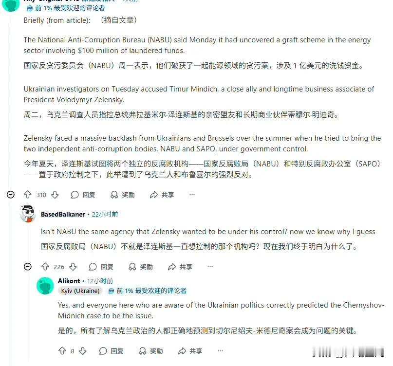欧美可能真的要放弃乌克兰了,开始爆出泽连斯基身边的人贪污了,早不爆,晚不爆,这个时候爆出来,欧美可能真的跟俄罗斯耗不下去了,北约又不敢直接派兵,如果继续耗下去,欧美国只能不断地往乌克兰砸钱和武器,现在欧美的经济情况,根本就没办法继续这样耗下去,估计是换掉泽连斯基,然后换个人跟俄罗斯谈和了!
