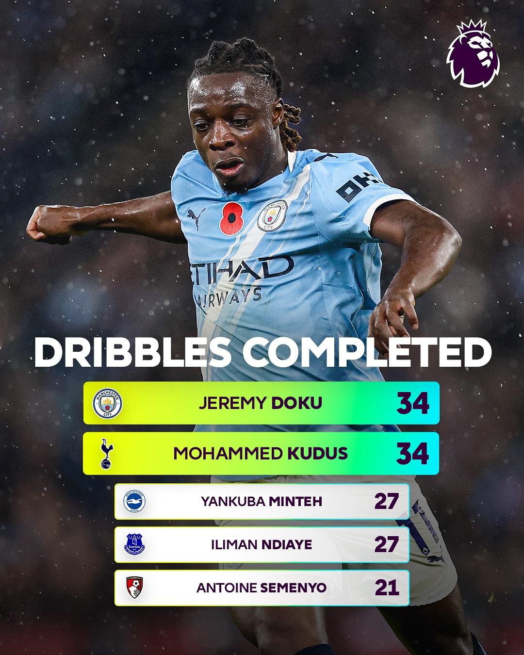 虎扑11月13日讯英超官方盘点本赛季英超球员过人次数,多库与库杜斯以34次并列第一。