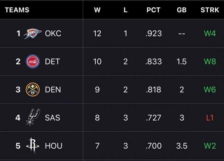 目前联盟战绩前五: 1、雷霆:12胜1负 2、活塞:10胜2负(东部) 3、掘金:9胜2负 4、马刺:8胜3负 5、火箭:7胜3负 这个排名最有意思的地方不在于西强东弱,而是这几个队伍的名字实在让人印象深刻。 在3个赛季以前,除了掘金之外,雷霆、活塞、马刺、火箭都在摆烂争状元,结果几个赛季之后形势逆转,改成争冠军了。 NBA球队的阵容变化太快,年轻球员的崛起也足够迅速,几个流量大队依靠老牌球星已经撑不起场面了,快船、湖人、勇士都有各自的麻烦,他们或许也拥有在一场比赛里击败雷霆、掘金的能力,但到了系列赛,基本没啥机会。 时代变了,轮到另一批球星主导NBA,下一批的球迷也要跟着他们一起成长了。