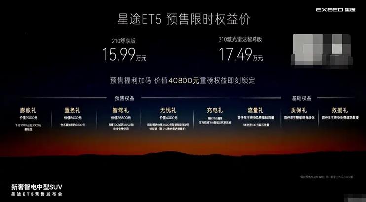 11月13日,星途品牌旗下星途ET5正式开启预售,共推出2款新车,预售限时权益价