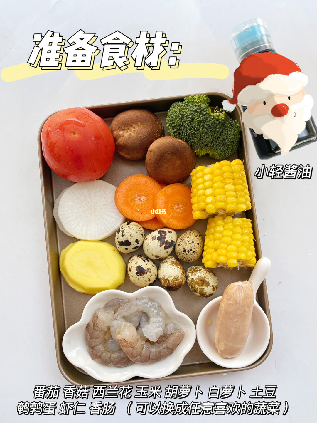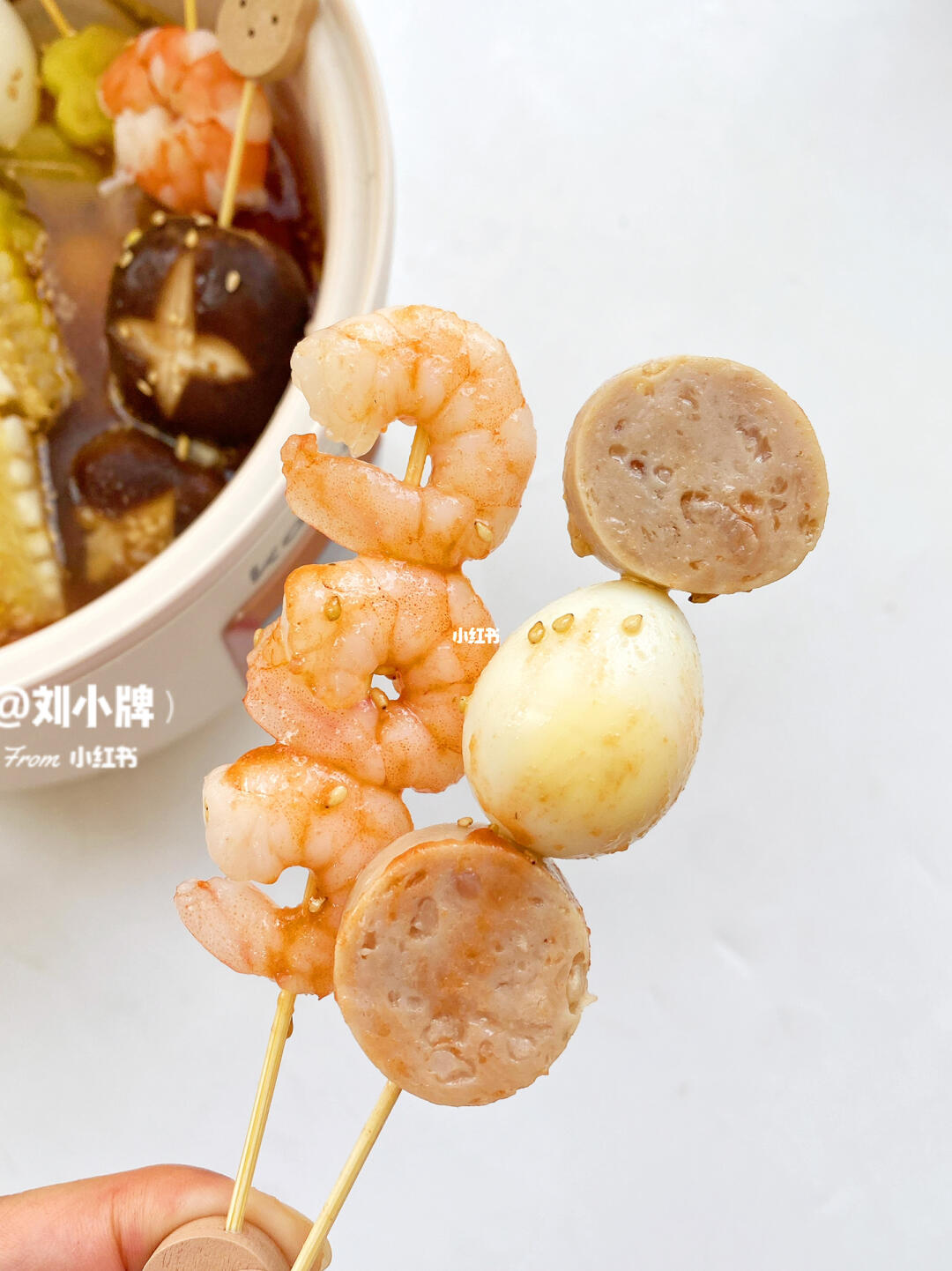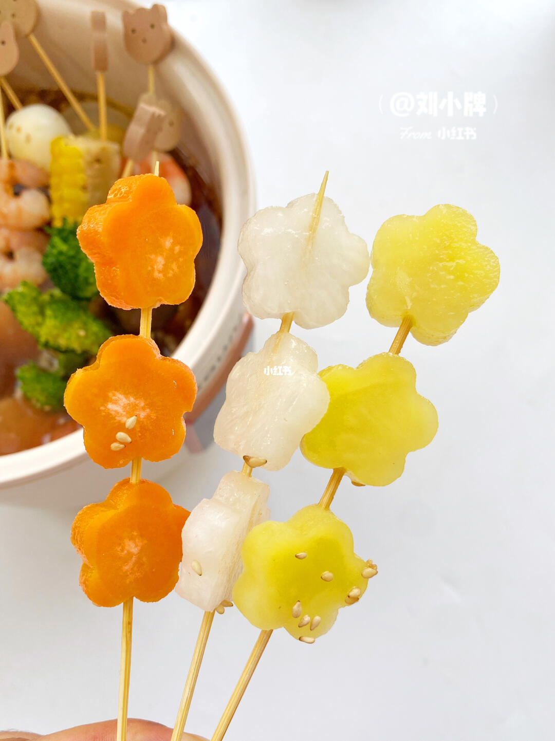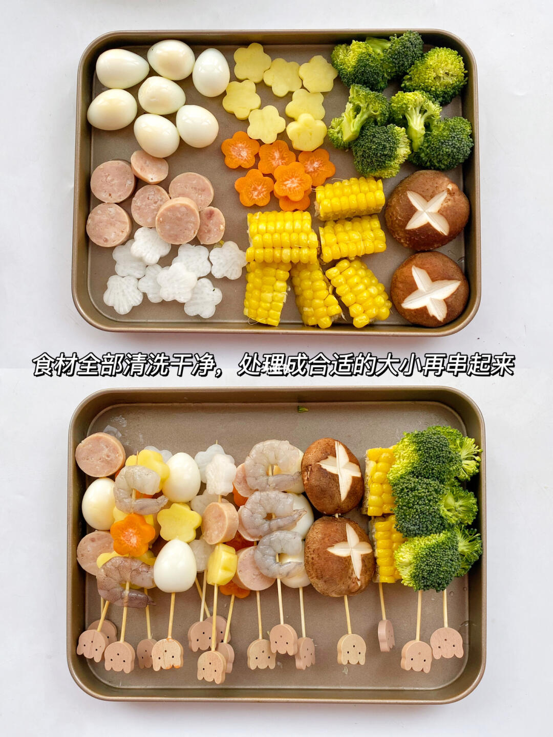 ✅食材全部处理好串起来,再全部煮熟。像土豆、白萝卜、胡萝卜、香菇、玉米要多煮一会儿,西蓝花、虾仁、香肠都是比较容易熟的。