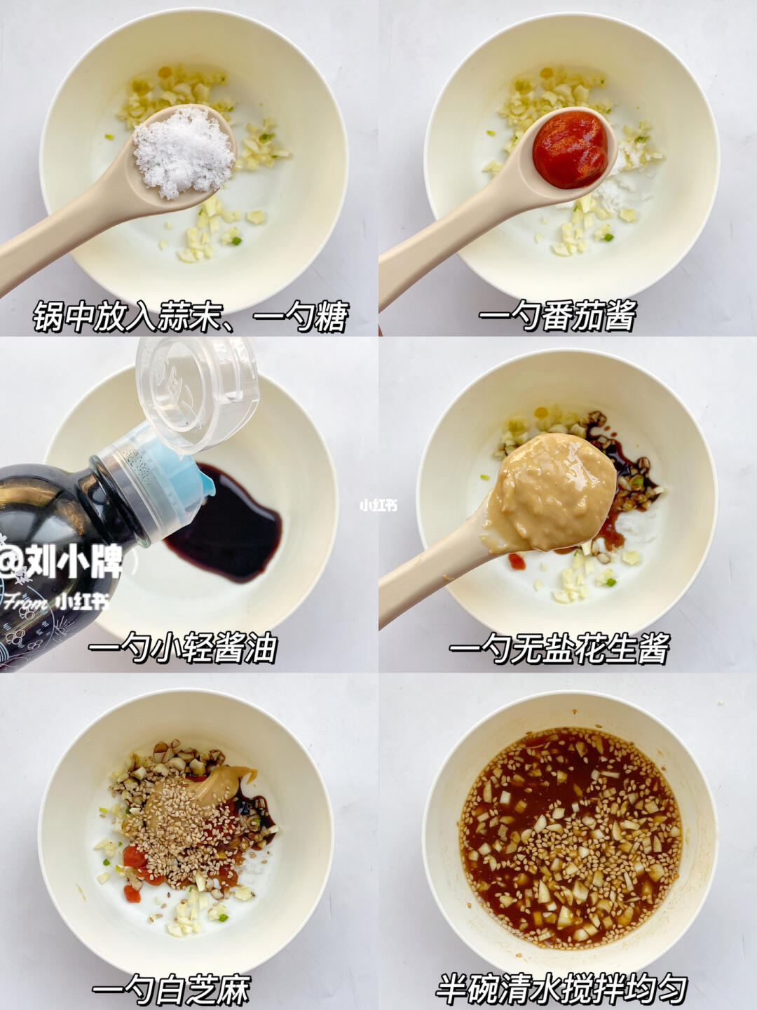 ✅再来调一个酱汁:蒜末+一勺白糖+一勺番茄酱+一勺小轻酱油+一勺花生酱、半碗清水搅拌均匀。给宝宝吃的小轻酱油,小小的一瓶,三周就能吃完,每口都是新鲜的。4种天然配料,宝宝吃更安心。