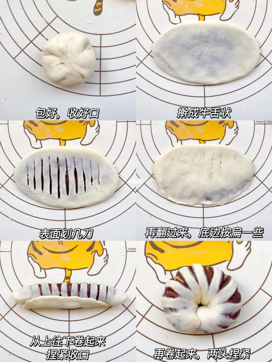 3⃣️取一个面团擀圆,包入豆沙捏紧收口,擀成牛舌状表面用到划上刀口。翻面把底部按扁,从上往下卷起收口捏紧,两头对折捏紧。