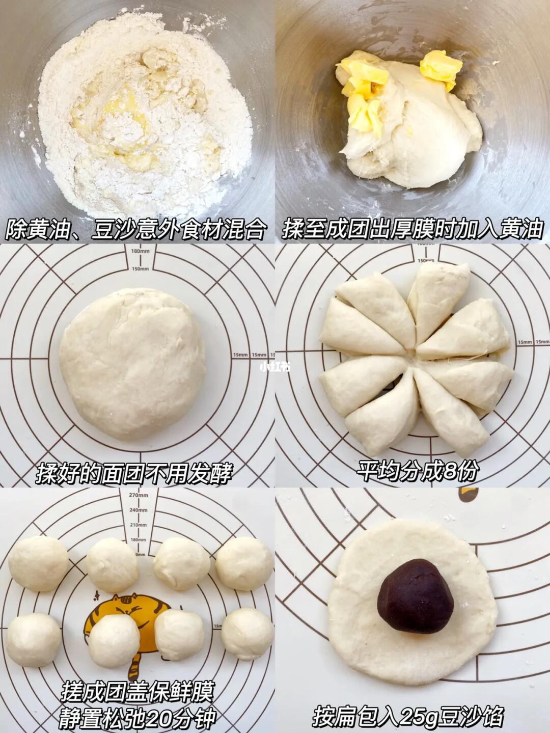 1⃣️除黄油和豆沙,把所有食材倒入盆中揉成团后加入软化好的黄油,继续揉搓能拉出厚膜。